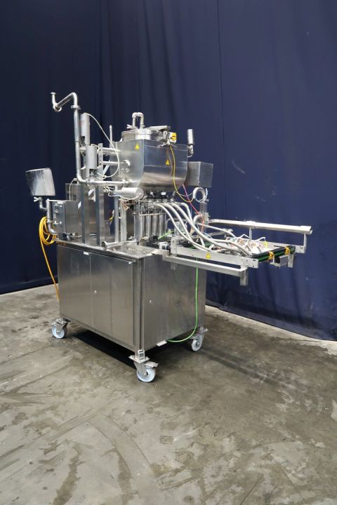 4 heads. Piston doser 10 - 50 ml for hot processed cheese to be mounted on top of a filling machine. Distance between pistons now : 10 cm. Agitator in hopper to keep hot product moving and prevent sticking to side. Double jacketed hopper with electric heating element for heating the jacket. Cleaning in cip possible. Own control panel with touch screen panel. Total dimensions: 260 x 120 x 240 cm.