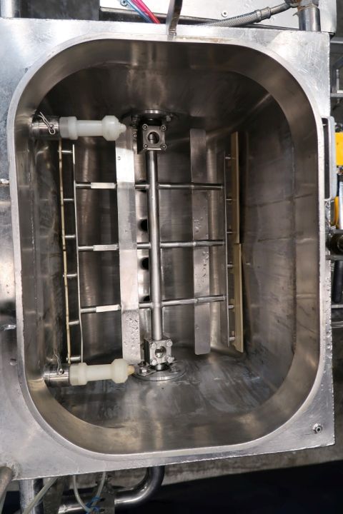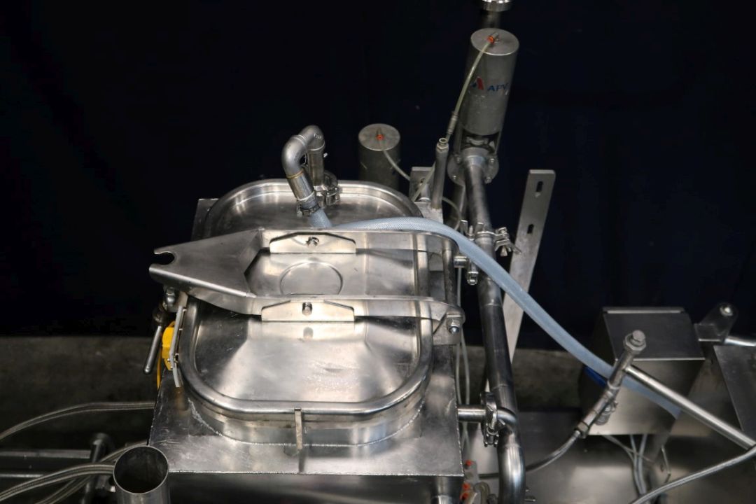 4 heads. Piston doser 10 - 50 ml for hot processed cheese to be mounted on top of a filling machine. Distance between pistons now : 10 cm. Agitator in hopper to keep hot product moving and prevent sticking to side. Double jacketed hopper with electric heating element for heating the jacket. Cleaning in cip possible. Own control panel with touch screen panel. Total dimensions: 260 x 120 x 240 cm.