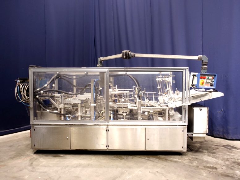 Fully automatic trayformer to make trays with logs from plano, format 4x6 = 24 cups/tray. The trays are formed in 4 steps including a step to glue in the middel of carton for re-inforcement carton by press fingers. Modicon TSX Micro PLC. Including hotmelt glue device, manufacturer Nordson, type: 3500. Total dimensions: 410 x 130 x 190 cm.
