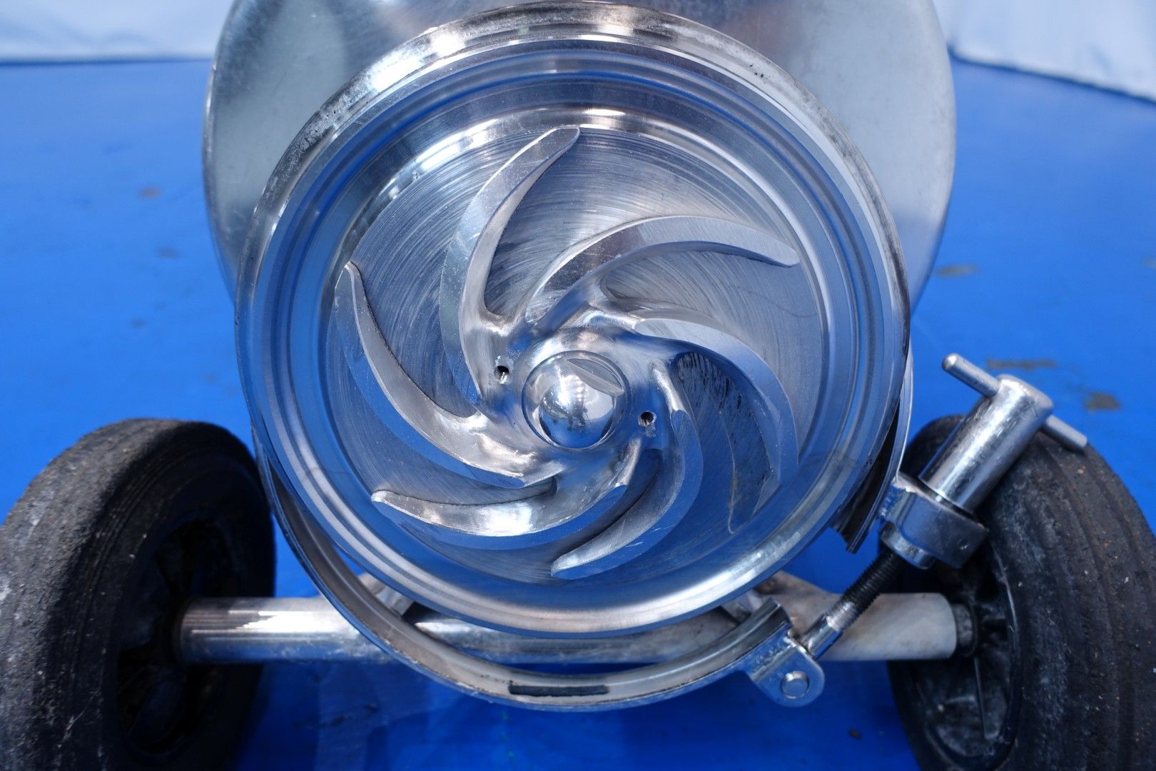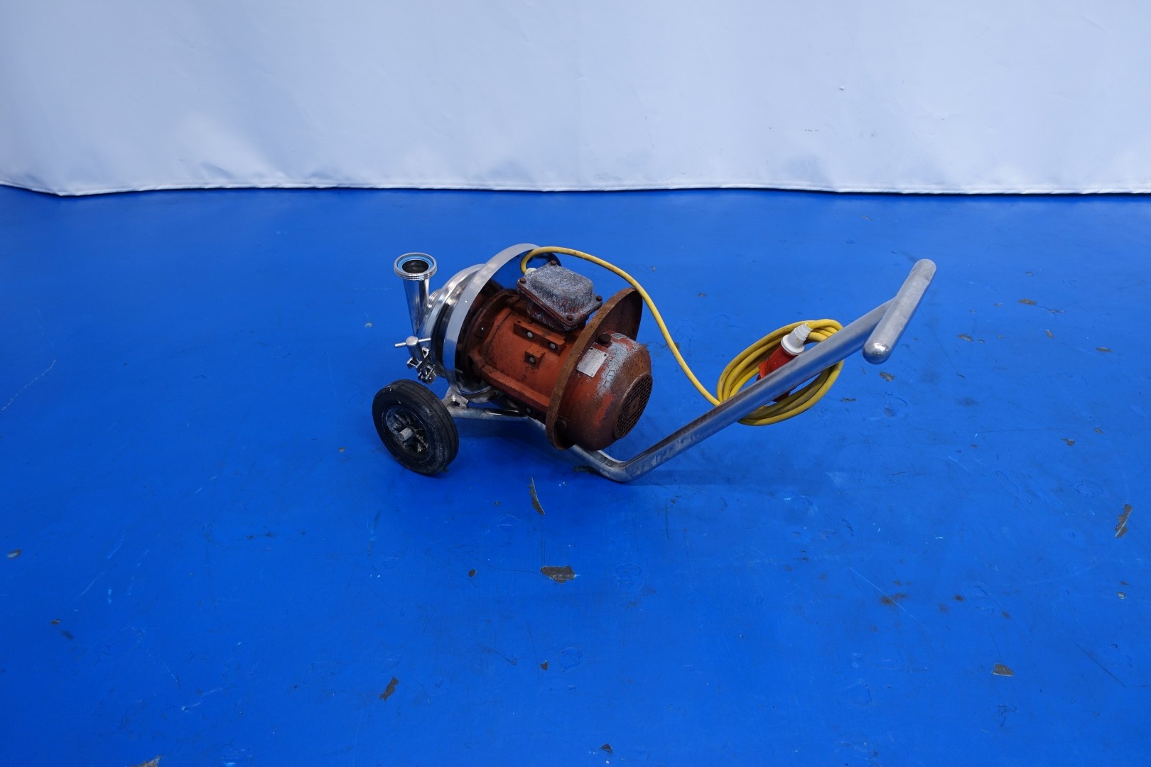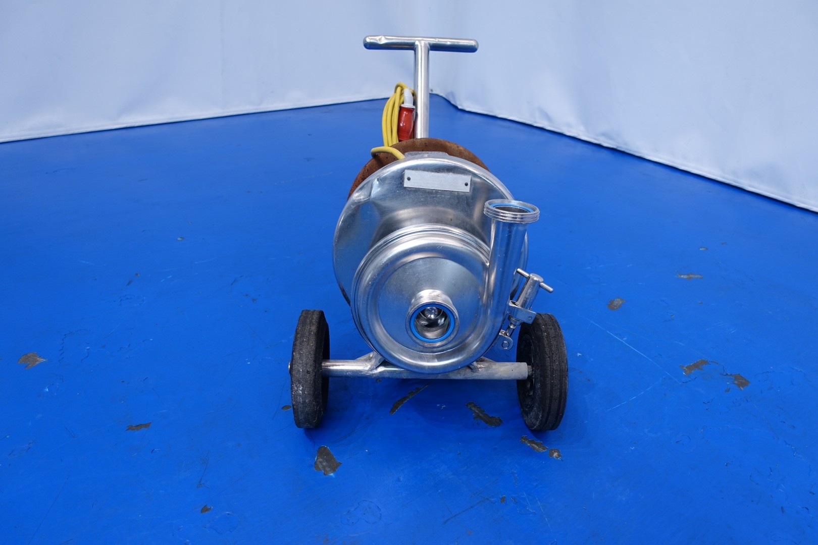 Sanitary centrifugal pump on mobile SS frame. Current motor: 3,6 kW - 7,1 A - 50 Hz - 2.875 rpm. Impellor diameter: 170 mm. Connections: (in) 2,5" Din / (out) 2,5" Din. Total dimensions: 86x44x55 (lxwxh) cm - weight: 61 kg.