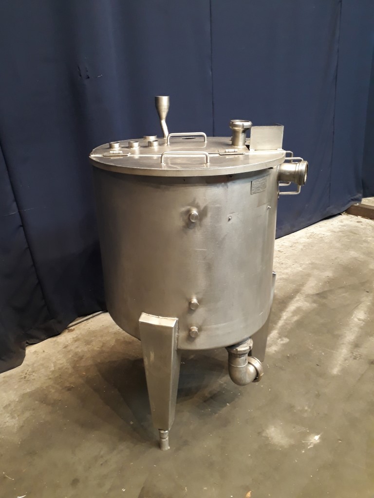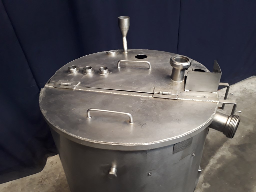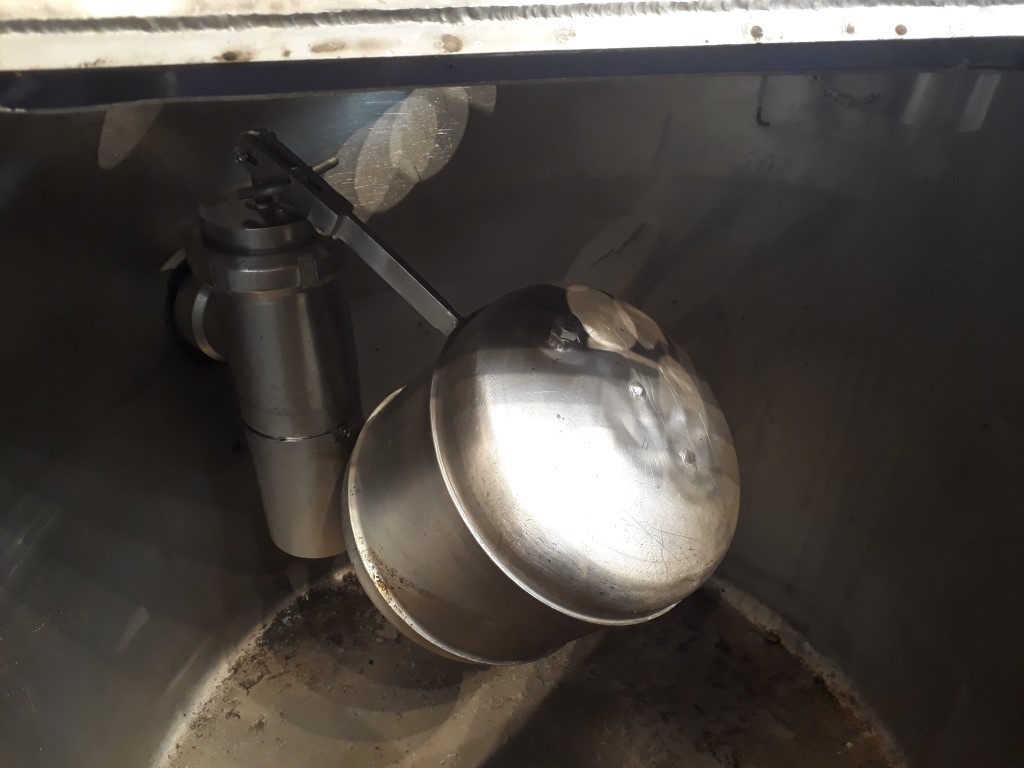 Level tank. Half open top with half lid. Flat to the sidem, product outlet 3'' DIN. Connectors for high and low level. Floater on inlet. 3 Adjustable feet. Inside dimensions of tank: diameter 70 cm and height 60 cm. Total dimensions lxwxh: 90 x 80 x 140 cm.