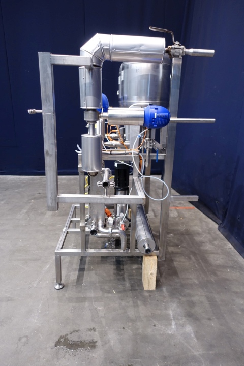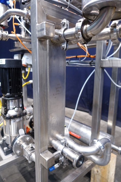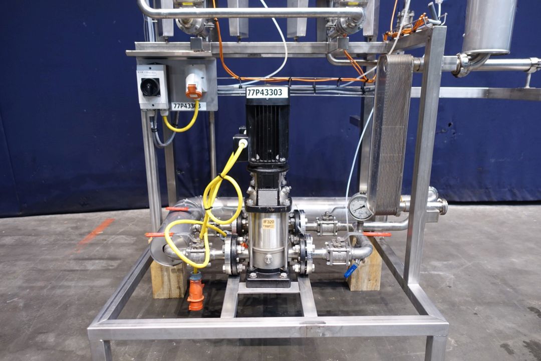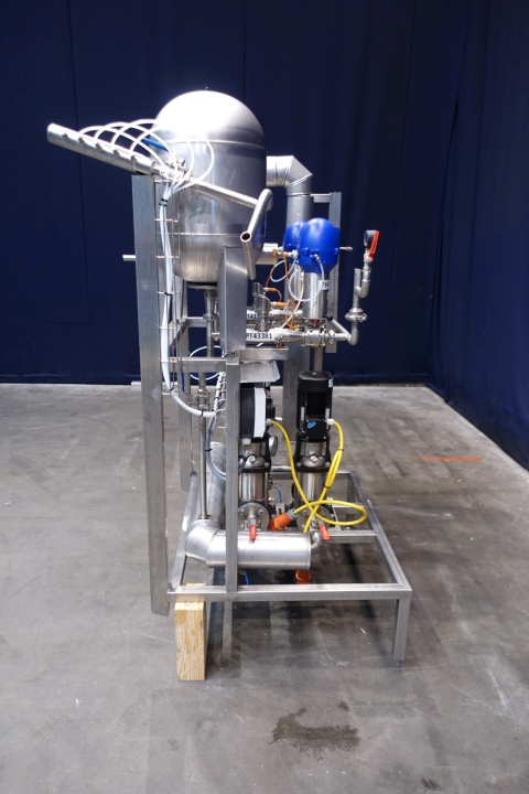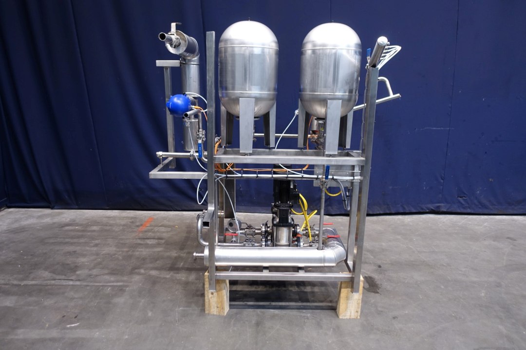 Water pump set (originally of cream pasteuriser). Set equipped with 2 x Grundfos circulation pumps (CRNS-6-A), with 2 x SS Joval pressure vessel (type 50 VIM, capacity 50 ltr.) with 1 x plate heat exchanger, non-sanitary,and valves. Connections: 2x 1,5" SMS. Total dimensions: 170x90x190 (lxwxh) cm - weight: 238 kg.