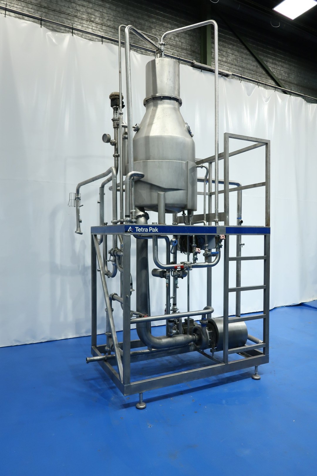 Vacuum dearator, skid mounted. Tank with Tangitial (side) inlet, partly double jacketed, vacuum pump, manometer, vacuum control valve (manual), infeed control valve (now set at 12,000/h) adjustable, double condenser: internal icewater cooled spiral heatexchanger in top of the deaerator for condens and flavour recovery, outfeed pump model: Tetra LKH-25/190 FSS (serial no. 036472 - bj 2001 - 7,5 kW - Ø 190 mm) - flushed seal. Capacity range deaerator unit: 8,000 to 20,000ltr/h. P&ID available. Documentation (electrical diagram and component details) included. Total dimensions: 270x205x420 (lxwxh) - weight: 605 kg.