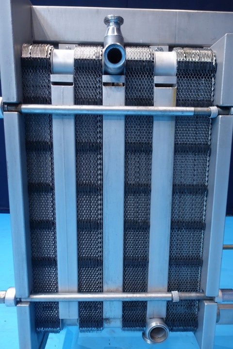 Plate heat exchanger, sanitary (PHE). Pressure: 10,0 bar. Beam length: 180 cm. Connections: 2x 2" Din and 10x 3" SMS. Current configuration: 4 Sections: 17-18-18-24 plates, in total 77 plates. Connections head: 2 up, follower 2 down. Total dimensions: 196x75x185 (lxwxh) cm - weight: 1.098 kg.