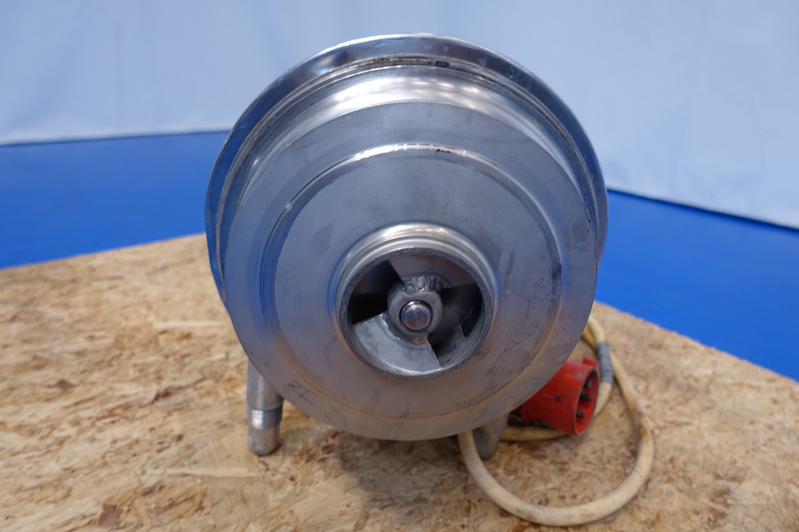 Sanitary centrifugal pump. Current motor: 7,5 kW - 15 A - 2.900 rpm - 50 Hz. Impellor diameter: 210 mm. Connections: (In) 3" Din / (Out) 3" Din. Total dimensions: 62x27x42 (lxwxh) cm - weight: 112 kg.