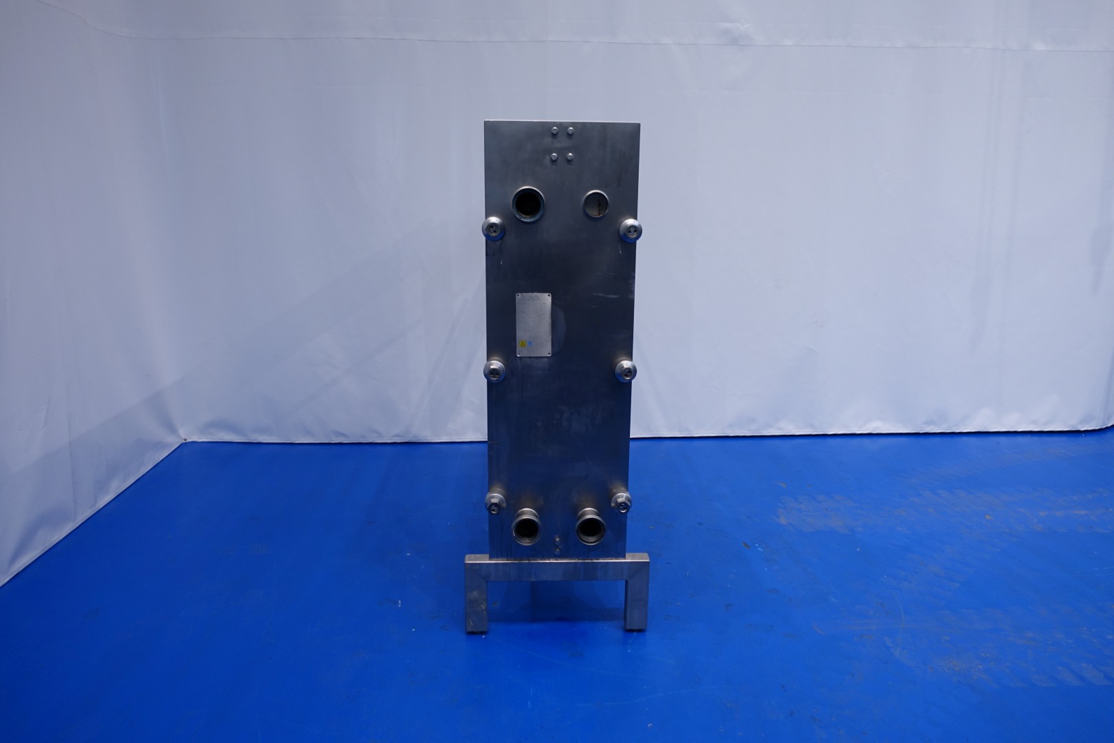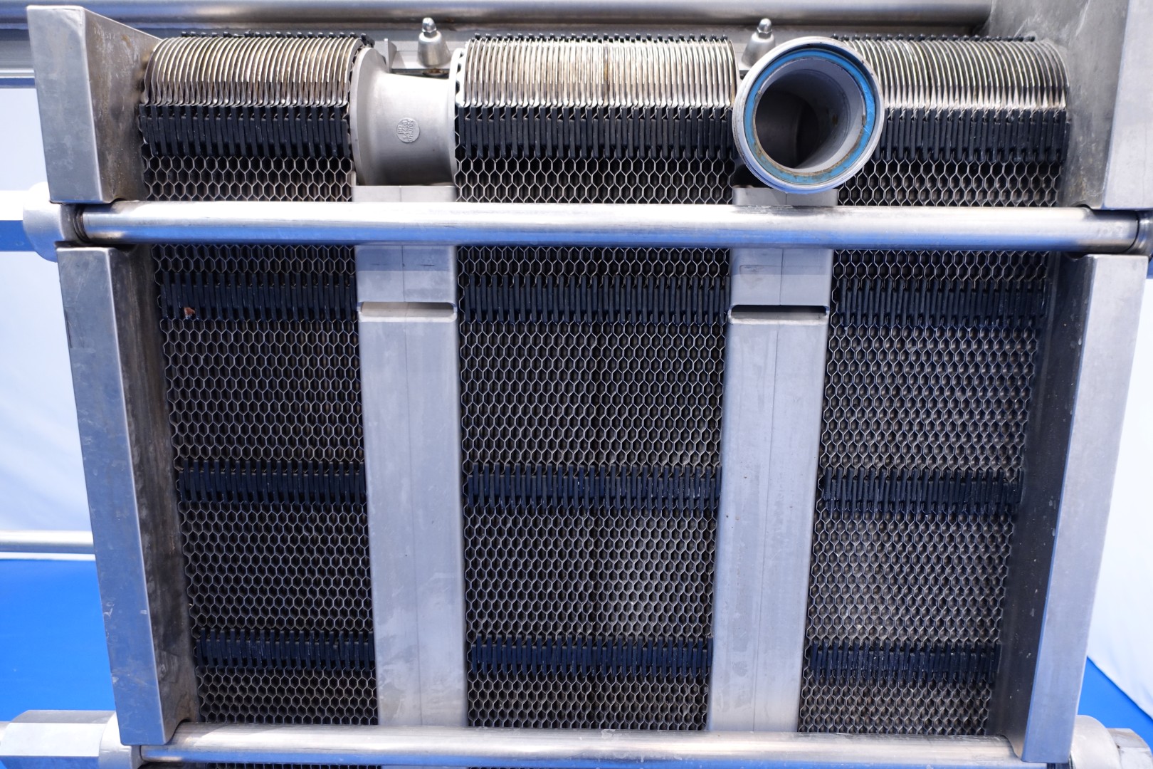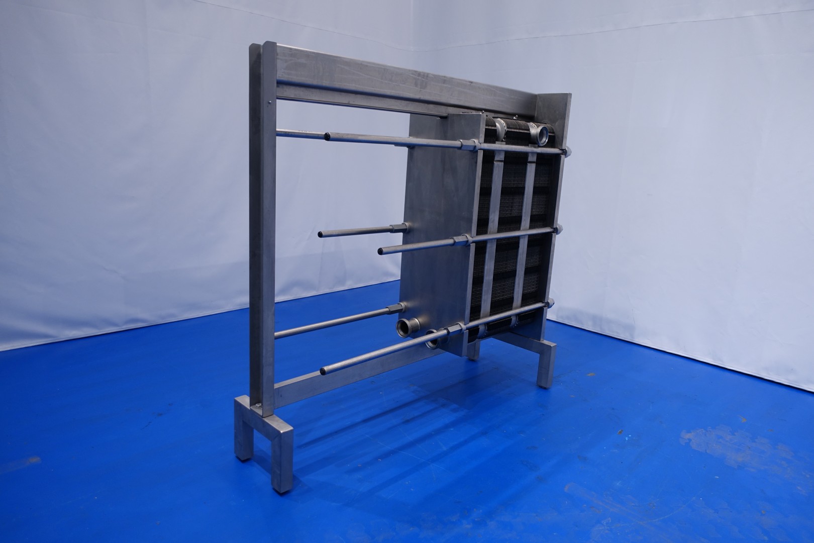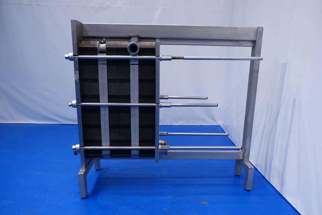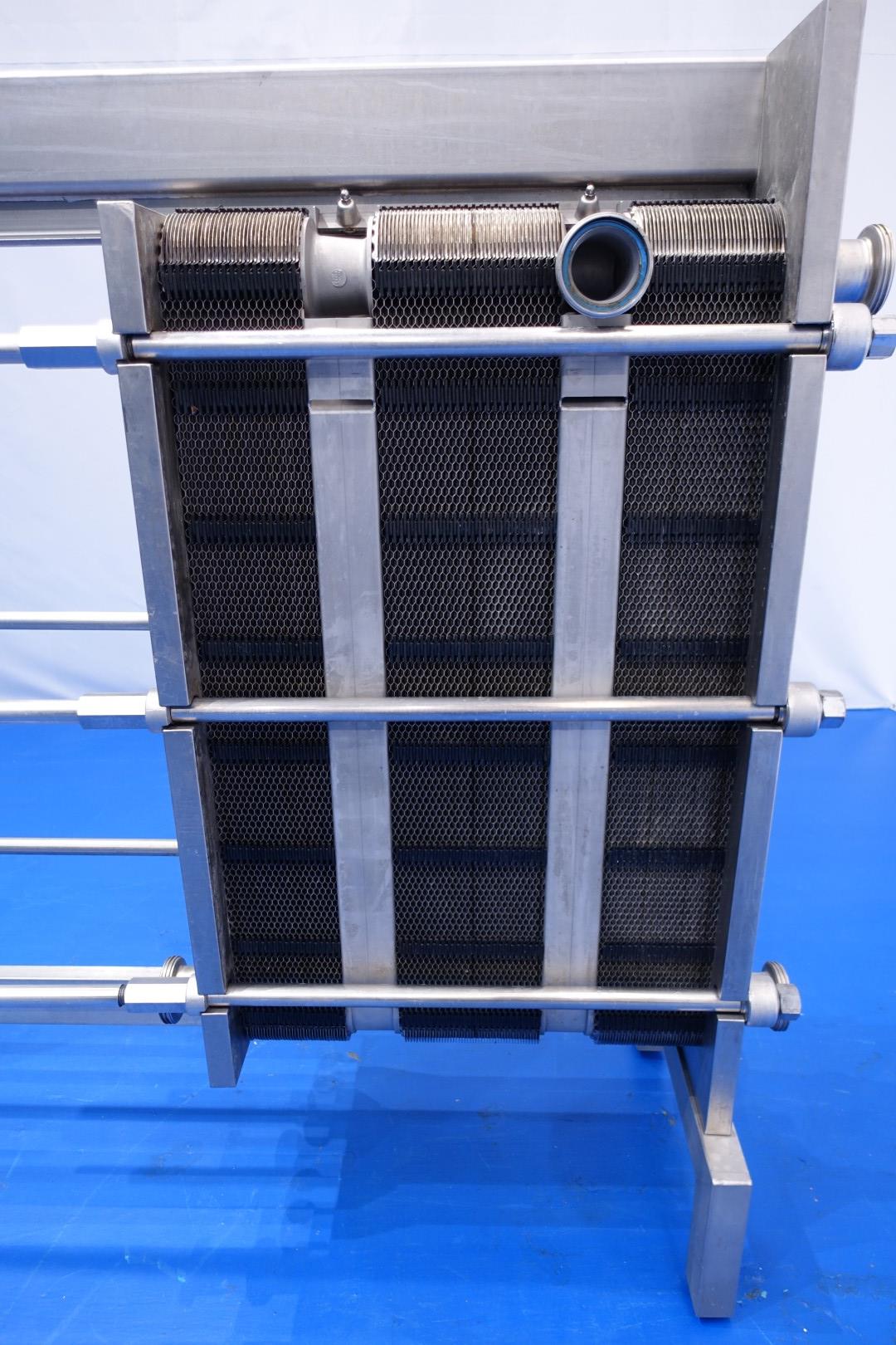 Plate heat exchanger, sanitary (PHE). Pressure: 10,0 bar - beam length: 180 cm, connections: 8 x 3" Din. Currenct configuration: 3 Sections: 37-48-36 plates (total 121 plates) - Connections head: 2 up and 2 down, follower 2 down. Total dimensions: 200x67x180 (lxwxh) cm - weight: 904 kg's.