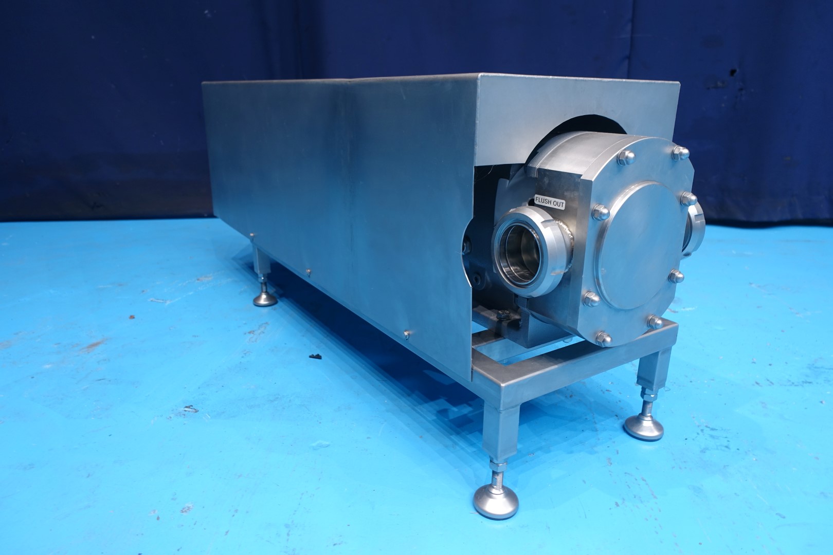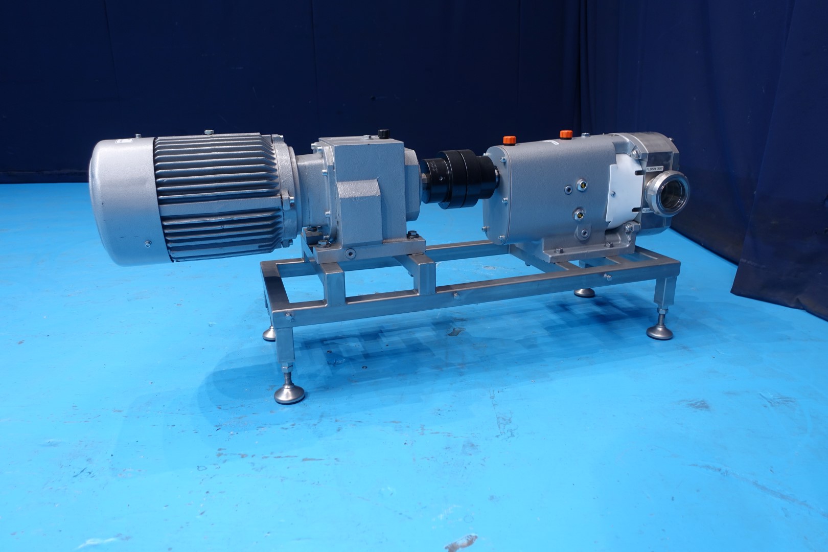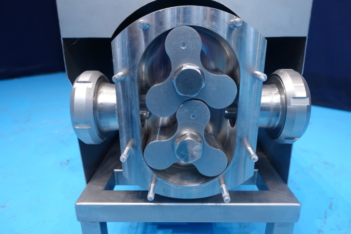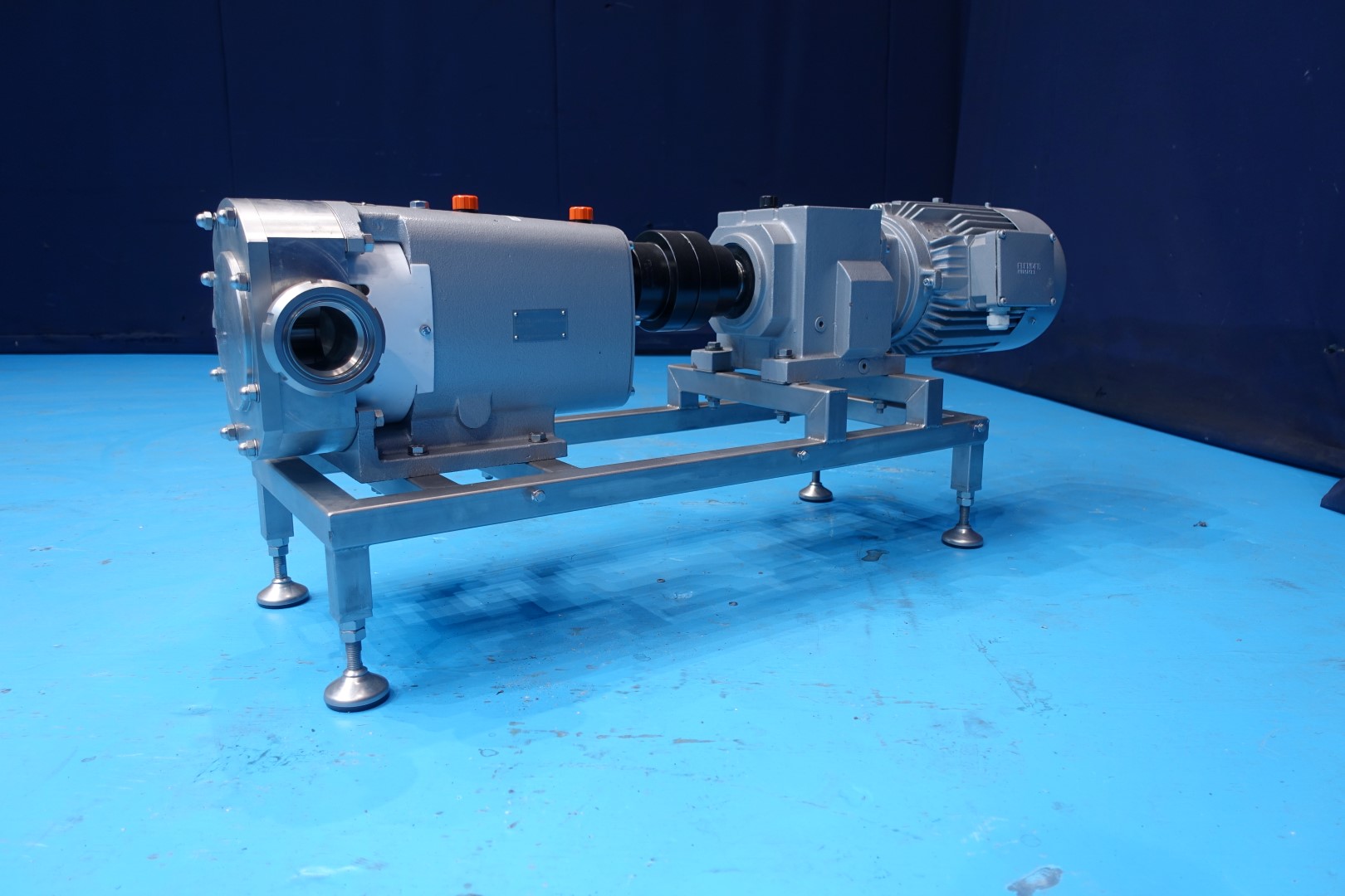 Reconditioned lobbe pump with tri stainless steel lobbes. Diameter lobbes: 125 mm. Displacement per revolution: 1,16 ltr. Maximum speed: 1.000 rpm. Current drive work: motor: 7,5 kW - 15,5 A - n1: 1.445 rpm - n2: 414 rpm. Design pressure up to 10 bar. Flushed seal. Mounted on plate with adjustable feet. Connections In: 3" SMS - Out: 3" SMS. Weight: 274 kg.