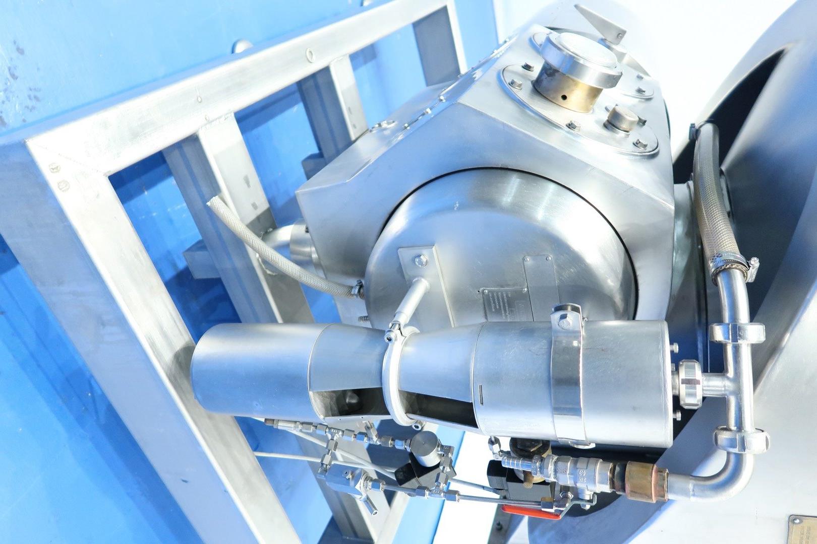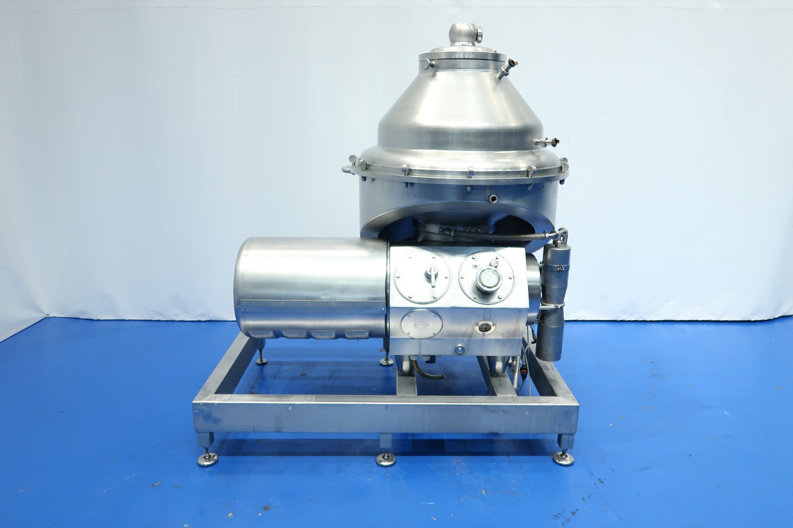 Fresh cheese - Quark - Greek Yoghurt -Skirr -Labaneh separator, Self cleaning nozzle separator with 12 nozzles. Capacity on input 5,000 up to 9,000ltr/h, Capacity depending on Protein content on inlet and desired total solids on outlet up to 3,000kg product out (max 20% ts). The separator concentrates fermented skimmilk in a ratio of approx 2,2/3ltr input to 1ltr concentrate on output. Bowl speed 4,280rpm, nozzle size: 4x0,7mm 8x0,8mm. Motor: 37kW - 70 A - 1.440 rpm, with SS motor cover and stainless steel base frame. With fluid clutch and OWM/watermodule. Excluding tools and small items can be offered upon request. Dimensions: 183x130x210 (lxwxh) cm - weight machine: 1.480 kg, bowl 486 kg; total 1.966 kg.