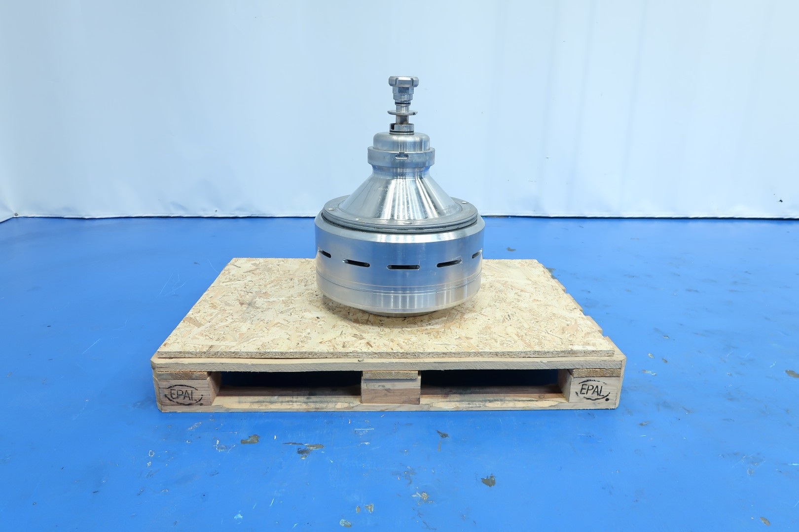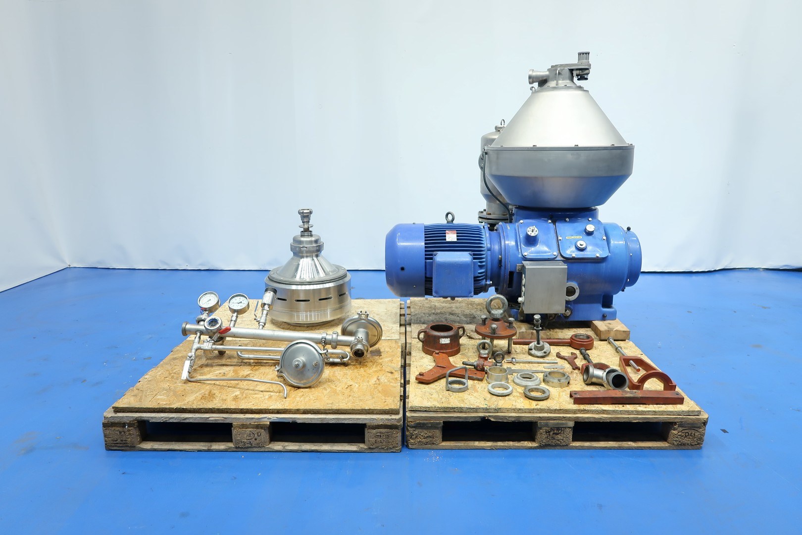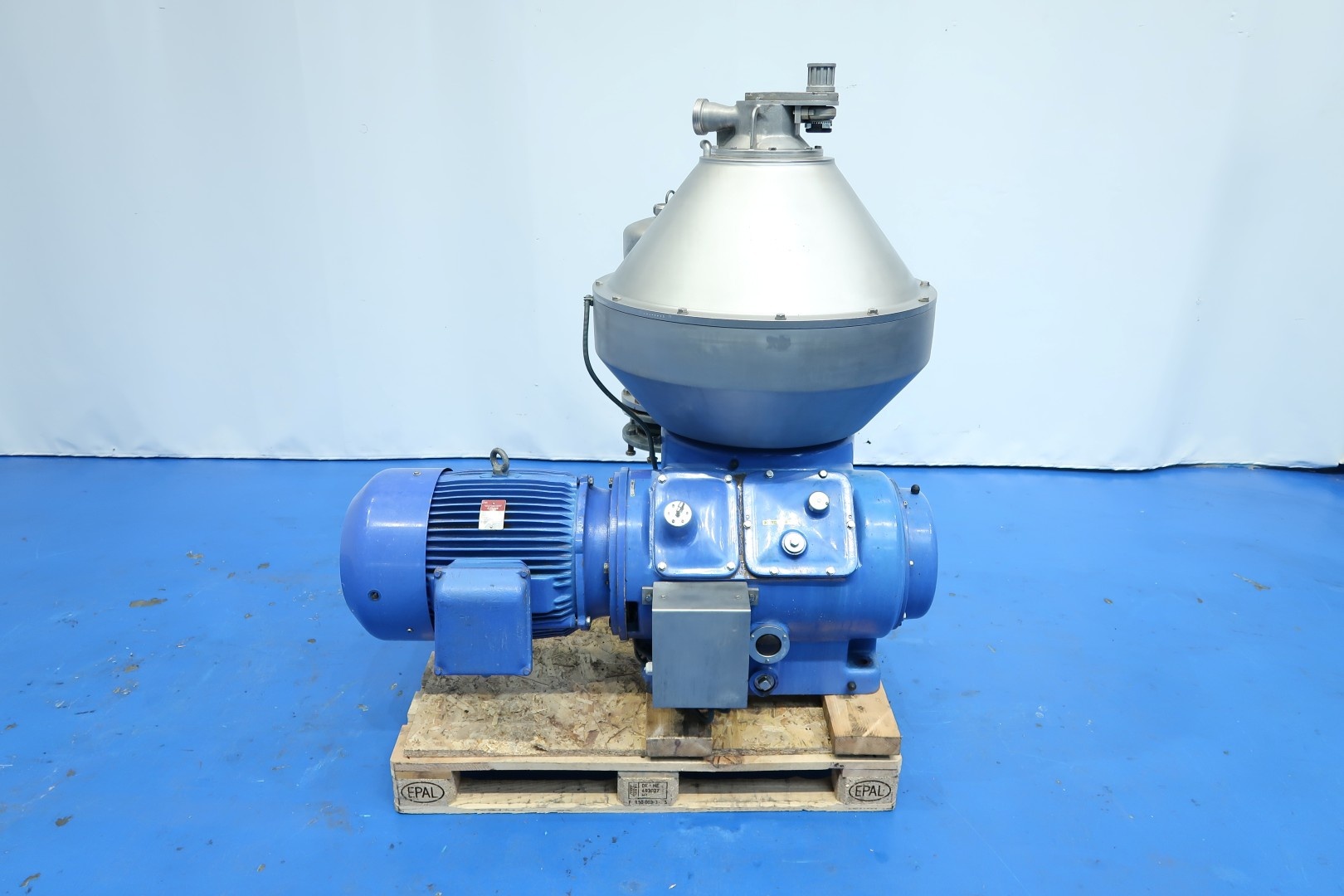 Separator used on (vegatable) fat - oil dehumidification, or other products wicht require to take out water and are below 1klg/ltr, self cleaning, also works as a clarifier (extra clarify disks). including bowl, bowl speed: 6.240 rpm, cyclone, pneumatic counter pressure valve milk. Motor 18,5kW - 34,6 A - 1.440 rpm. Set of tools with ring key and pressing tool. Without controls (can be offered upon request). Density in 1.000-1.040 sendiment 1.140 kg/m3. Mixing units available under STN16081 and STN16082. Documentation available: Technical manual - Maintenance manual - parts list - installation manual. Dimensions: 140x140x153 (lxwxh) cm - total weight: 1.423 kg.