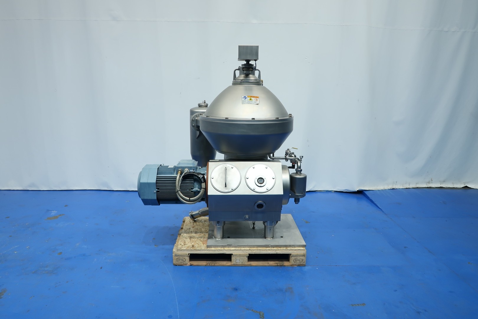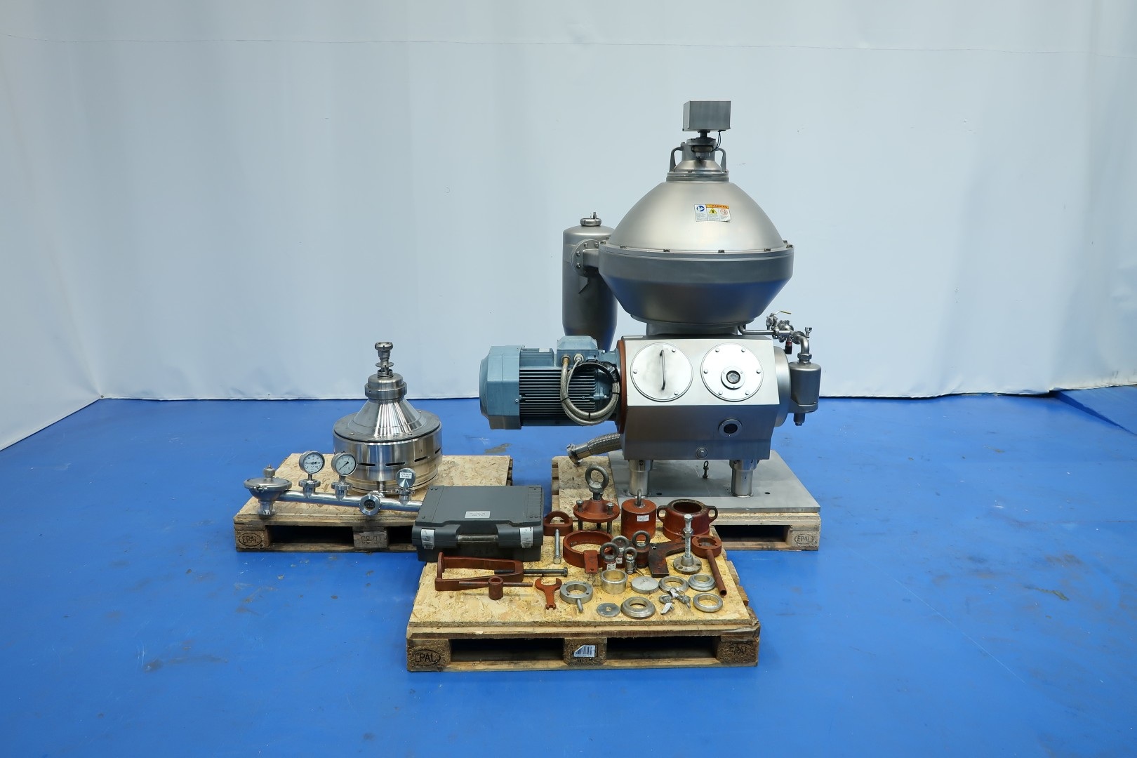 Separator, was used for vegatable fat - oil dehumidification, can be used for separation of any liquids which require to take out water and are below 1kg/ltr, self cleaning. Including bowl, bowl speed: 7.500 rpm, base frame, pneumatic counter pressure valve, OWM and cyclone. Motor 25,0 kW - 1.800 rpm - 60 Hz. Set of tools with ring key and pressing tool. Max. density infeed 1,100kg/m3 on input. Without controls (can be offered upon request).This is a 3 way separator, 1 in and 3 out . Inlet bottom fed (hermetic design), out in top, light clean oil and heavy fase can be water with additives like chemicals, like phosphoric acid and sludge (heavy particles) A separate mix-unit available under STN16080. Documentation: instruction manual and parts list. Dimensions: 155x125x180 (lxwxh) cm - total weight: 1.096 kg. [Valérie Boer 14-04-2026 14:06 (GMT +02:00)] Handleiding boek compleet