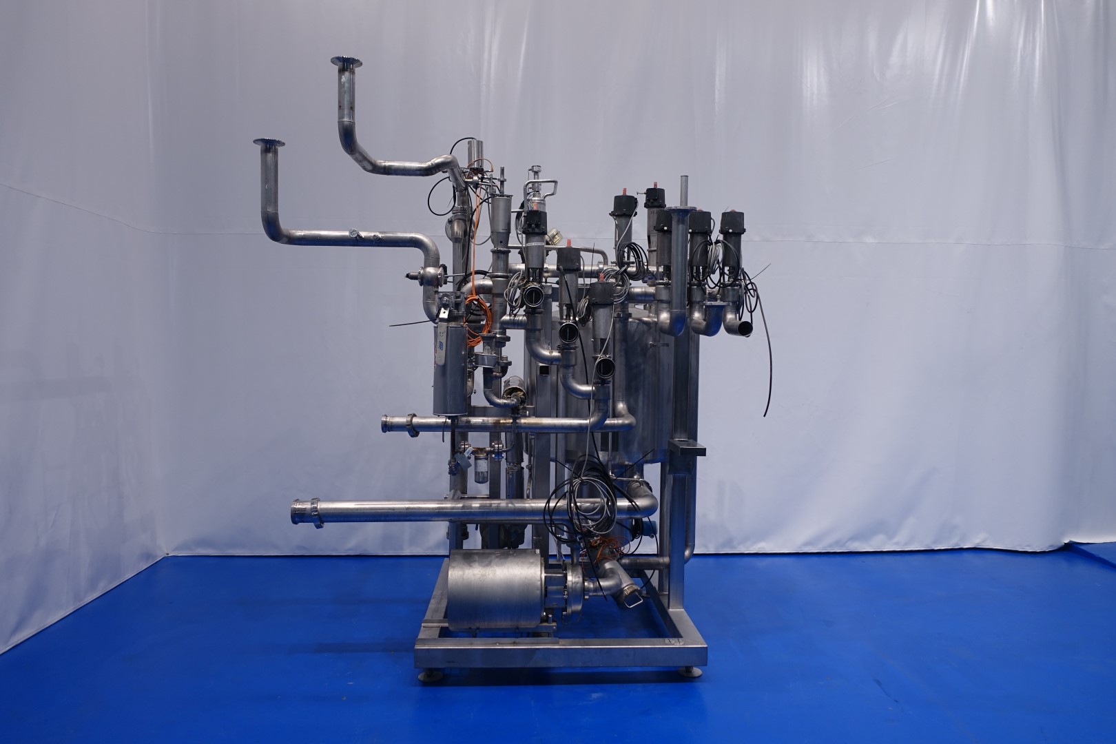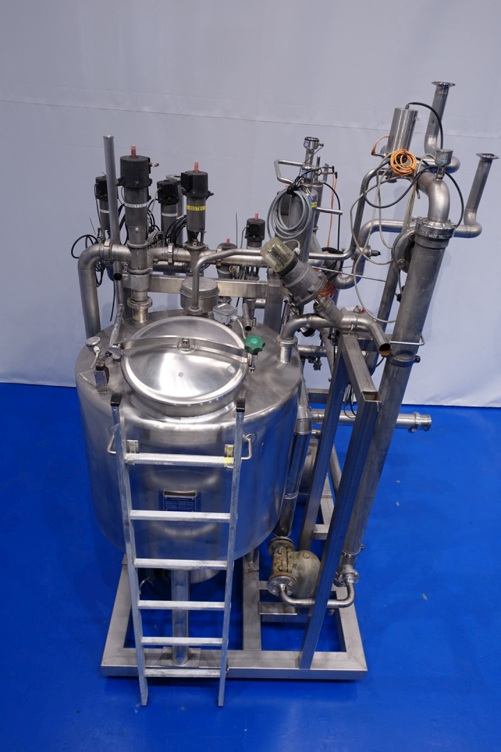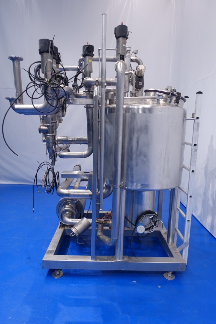 Skid mounted Cip unit which includes all items to make a CIP except the lye and acid tanks. included is a balance vessel, centrifugal pump, tubular heat exchanger, 2 x Siemens mass flow transmitter, valves and piping. Single jacketed balance vessel, capacity: 500 ltr with 2 x cip spray bowl. Alfa Laval LKH20/165 centrifugal pump - 5,5 kW - 2.880 rpm - impellor Ø 165 mm - connections in: 2,5" Din - out: 2,0" Din.capacity: 25m3 up to 3,5bar or 50m3 up to 2,5bar. Tubular heat exchanger Spiral flow multitube - tube length 196 cm - outer Ø 100 mm with 19 pipes of Ø 14 mm. Total dimensions: 210x190x281 (lxwxh) cm - weight: 630 kg.