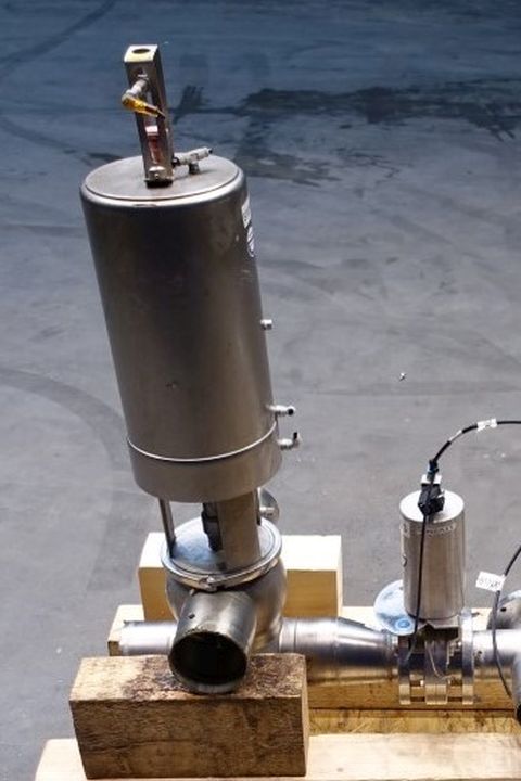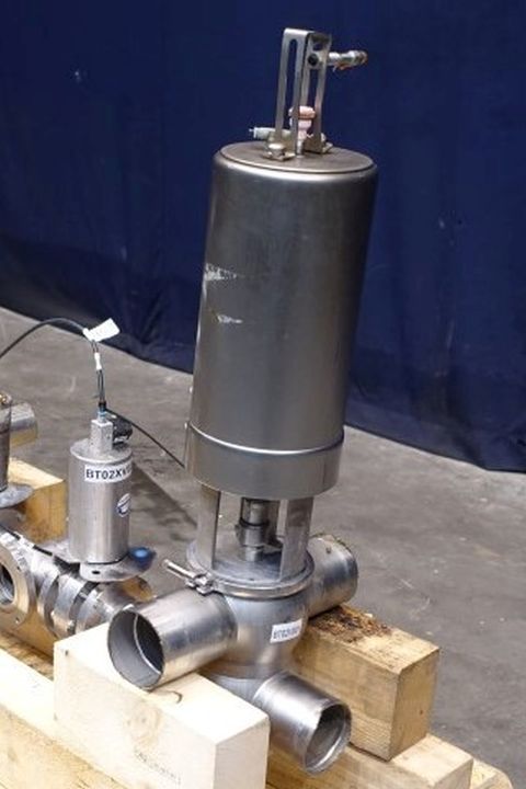 Mixproof valve with seat lift. 4-Way. Butterfly stop valve between flanges. Pneumatic activated. Diameter: 4" Weld-Weld / 4'' Weld-Weld. Single position sensors.