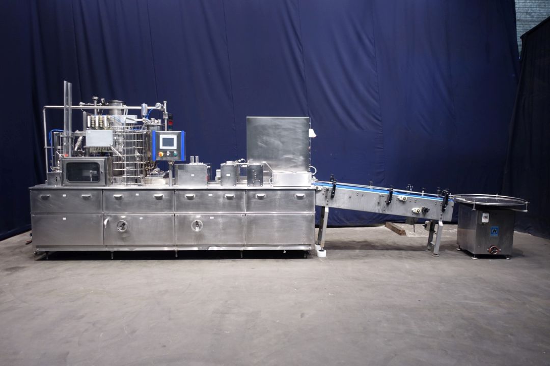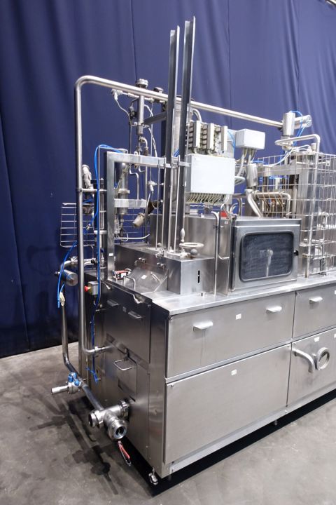 "2 Line ultra clean cup filling machine, cup diameter 75 mm. Cup decontamination with H2o2, pre-doser for fruit pulp on bottom of cup 10 – 50 ml, main doser (100-275 ml), CIP cleanable, lid dispending, infrared light lid decontamination and heat sealing. outfeed conveyor and Lazy suzan, 'turn-rotary table' for collecting on outlet. Total dimensions: 430 x 140 x 260 cm. Weight machine 3.400 kg - turning table Ø 100 cm, weight 106 kg - conveyor belt length 210 cm, total width 35 cm, weight 140 kg's. New control panel with new hitachti PLC and Touch screen HMI and complete machine check up, made in 2010. Excluding blower and CIP return pump (Pomac). "