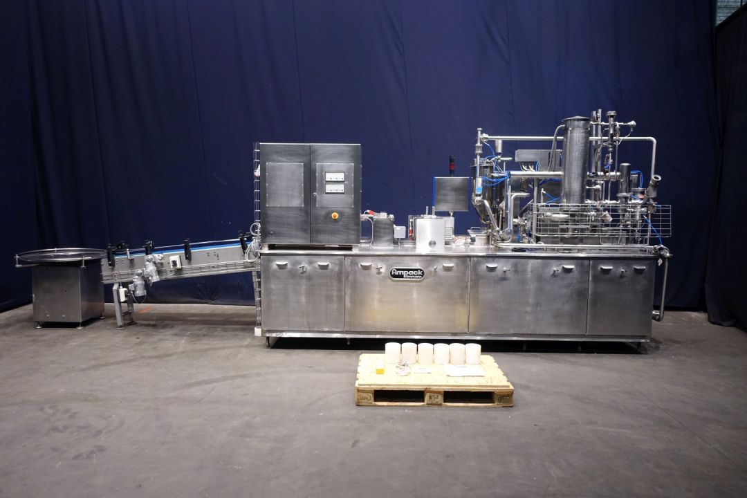 "2 Line ultra clean cup filling machine, cup diameter 75 mm. Cup decontamination with H2o2, pre-doser for fruit pulp on bottom of cup 10 – 50 ml, main doser (100-275 ml), CIP cleanable, lid dispending, infrared light lid decontamination and heat sealing. outfeed conveyor and Lazy suzan, 'turn-rotary table' for collecting on outlet. Total dimensions: 430 x 140 x 260 cm. Weight machine 3.400 kg - turning table Ø 100 cm, weight 106 kg - conveyor belt length 210 cm, total width 35 cm, weight 140 kg's. New control panel with new hitachti PLC and Touch screen HMI and complete machine check up, made in 2010. Excluding blower and CIP return pump (Pomac). "
