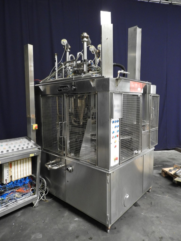 Rotatry cup filler with 4 filling heads. 8-Steps. Cup size: square 4-pack, 130x130 mm. Format per cup: square 55x55 mm. Stations: cup destacking, main piston doser (100-approx 220 ml) for viscose products (CIP cleanable), seal dispending by vacuum, heat sealing and outfeed station. Excluding outfeed conveyor. Machine has plexiglas safety guards. Machine is with an hepa air system with blower. Easy format change possible. Reading desk control panel with controls: Siemens S5. Total dimensions machine 200 x 190 x 280cm. Control panel: 130 x 50 x 260cm.