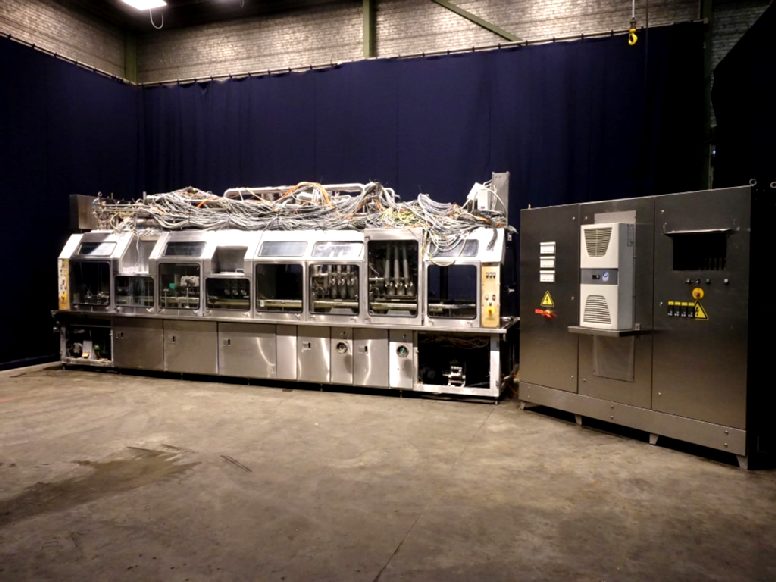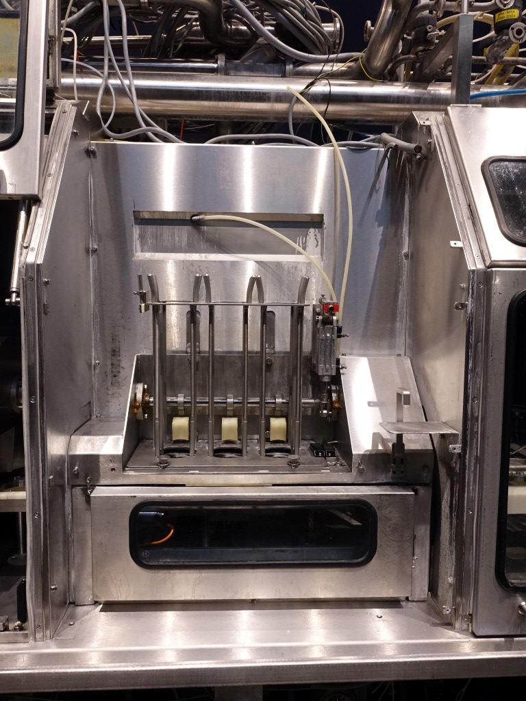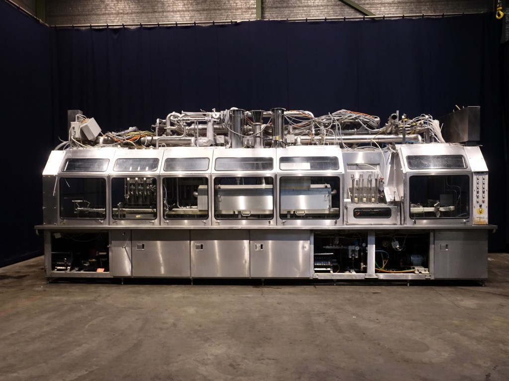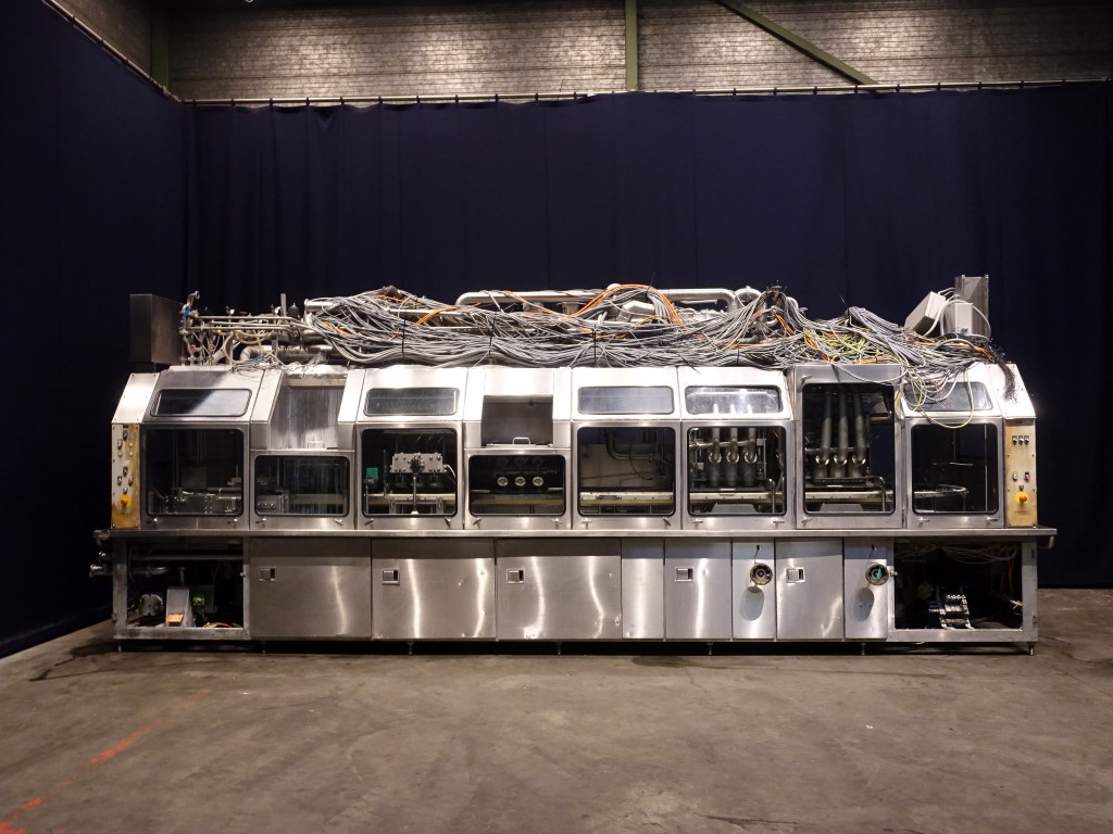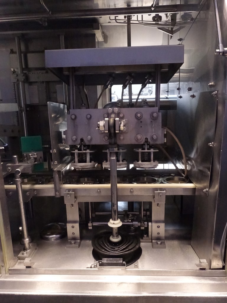 Ultra clean Caroussel filler with 3 heads. Current Cup size round: 95 mm. Stations: Cup destacking, no- or double cup detection by eye sensor, cup decontamination by peroxide (H2O2) in 5! steps, predoser (80 - 275 ml), maindoser (125 - 575 ml), afterdoser (80 - 275 ml) alle CIP cleanable, seal decontamination by wet peroxide (H2O2), dispensing by vacuum, heat sealing, sqeezing the cup while sealing, snap-on lid, spray system to disinfect the chain and cupholders, outfeed on 1,4 meter single lane conveyor. Machine has polycarbonate safety guards and has an automatic central greasing system. Easy format change. Ultraclean with sterile air and room sterilisation by wet peroxide. Controls: Siemens S5, Missing: seal/snapcap holders, HMI screen, blower and sterile filter for air, 1 air suction ventilator included. Users manual, electric manual, parts list available in German language. Total dimensions: 6,8 x 1,7 x 2,75 mtr.