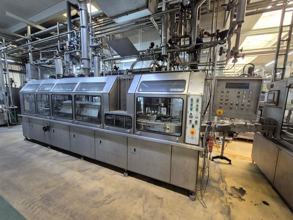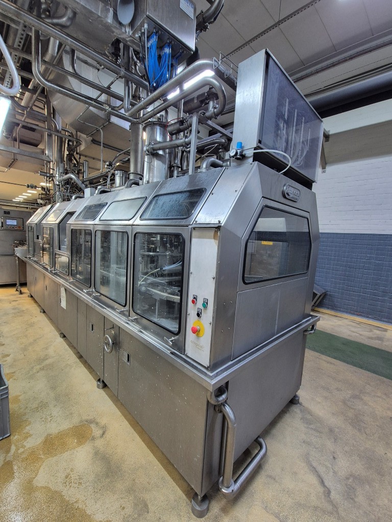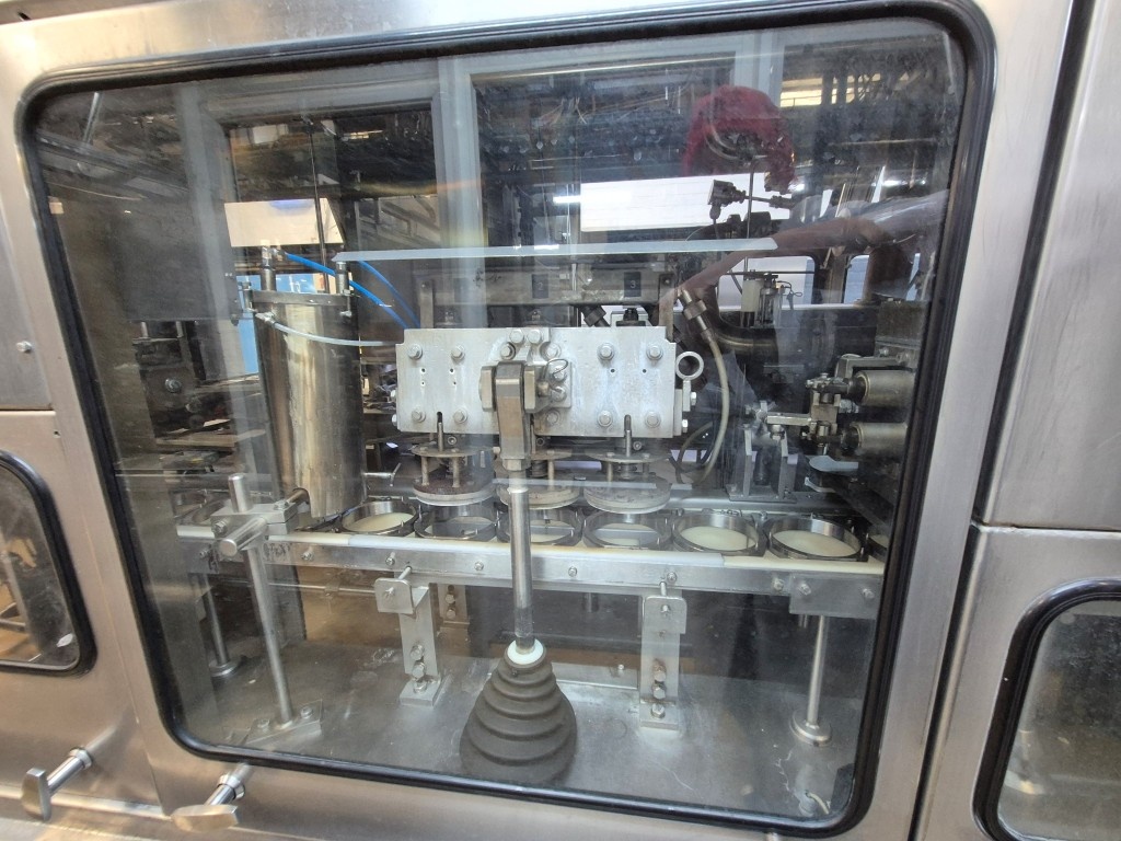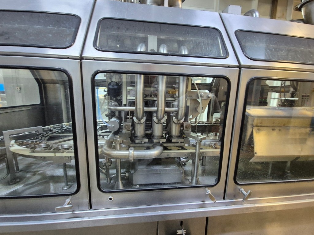 Carousel Cup filling- sealing machine. Formats on this machine round 95 mm. Capacity depends on viscosity and foam properties of the product and shape- and headspace of the packaging. Steps of the machine: 1) Preformed cups unstacking with vacuum, 2) Cup decontamination by peroxide injection and drying with superheated steam in 4 steps. Electric air heater built on the machine. 3)  Predoser, cutting of doser for viscous products like fruit jams,  CIP-cleanable by placing a cleaning bar. 4) Main doser, positive doser, combination filler, flexible for thinner and thicker products CIP-cleanable by placing cleaning bar. 5) Seal decontimanation (by infrared radiators) and applying station . 6) Heat sealing. 7) seal checking station by squeezing the cup and seal detecting. 8) Over Snap cap Lid pressure station (only for 95mm) 9) Outfeed to conveyor belt. Controls: Siemens Simatic S5. Original packer (ASGP4) also available under STN16003. Dimensions ca.: 600x175x280 (lxwxh) cm - weight: ca. 6.000 kg's.