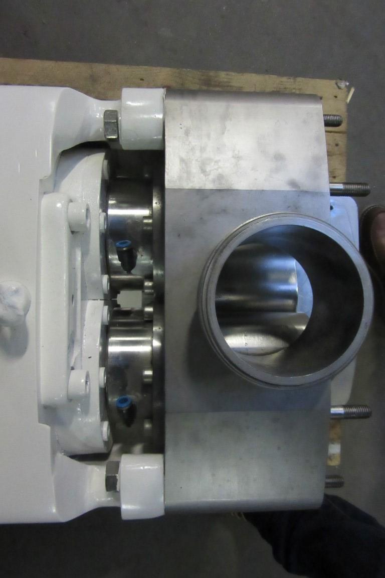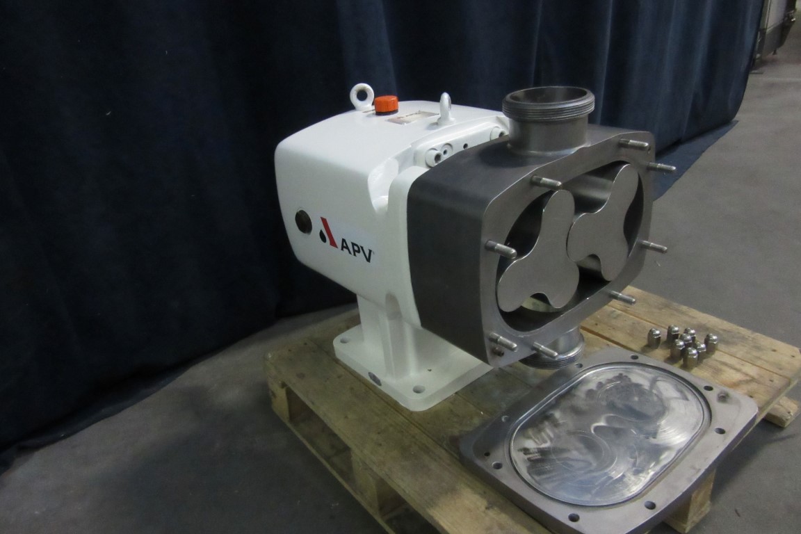 Sanitary positive displacement lobe rotary pump (without motor) for viscose products like curd / cream etc. Pump with Tri-lobe rotor of stainless steel. Connections in-/outlet 4’’. DIN11851. Maximum pressure up to 10 bar, max. 110°C. Displacement 2,92 ltr per rotation.