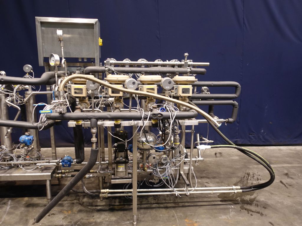 Scraped heater - cooler set, used as steriliser, including 3 holding tubes 30 - 30 - 210 seconds (various options possible on swingbend panel). Each scraped heaterexchanger has a temperature indicator on water and product. 2x Sets of APV Crepaco 3VT422 scrape surface heatexchangers, vertically mounted, diameter tube approx 10 cm, diameter rotor 3,5 cm, length of tube 65 cm, 2 scrapers on the rotor. 1 skid with heaters (by steam indirect), each unit has its own control valve (Samson) and temperature controller in the electronic panel, 1 skid with 3 tubes used as cooler. Scrapers hydraulic (oil pressure) driven, separate hydro set included (5,5 kW). Dimensions skids: 410 x 180 x 210 cm, hydro unit: 90 x 70 x 110 cm.