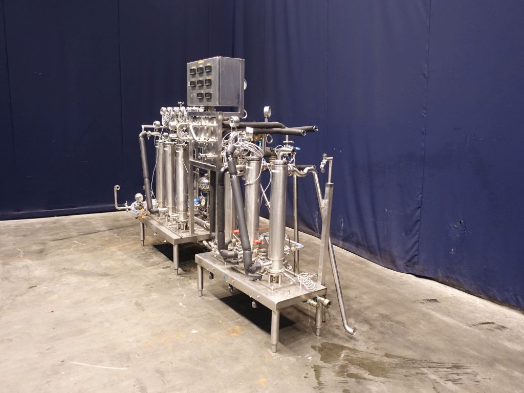Scraped heater - cooler set, used as steriliser, including 3 holding tubes 30 - 30 - 210 seconds (various options possible on swingbend panel). Each scraped heaterexchanger has a temperature indicator on water and product. 2x Sets of APV Crepaco 3VT422 scrape surface heatexchangers, vertically mounted, diameter tube approx 10 cm, diameter rotor 3,5 cm, length of tube 65 cm, 2 scrapers on the rotor. 1 skid with heaters (by steam indirect), each unit has its own control valve (Samson) and temperature controller in the electronic panel, 1 skid with 3 tubes used as cooler. Scrapers hydraulic (oil pressure) driven, separate hydro set included (5,5 kW). Dimensions skids: 410 x 180 x 210 cm, hydro unit: 90 x 70 x 110 cm.