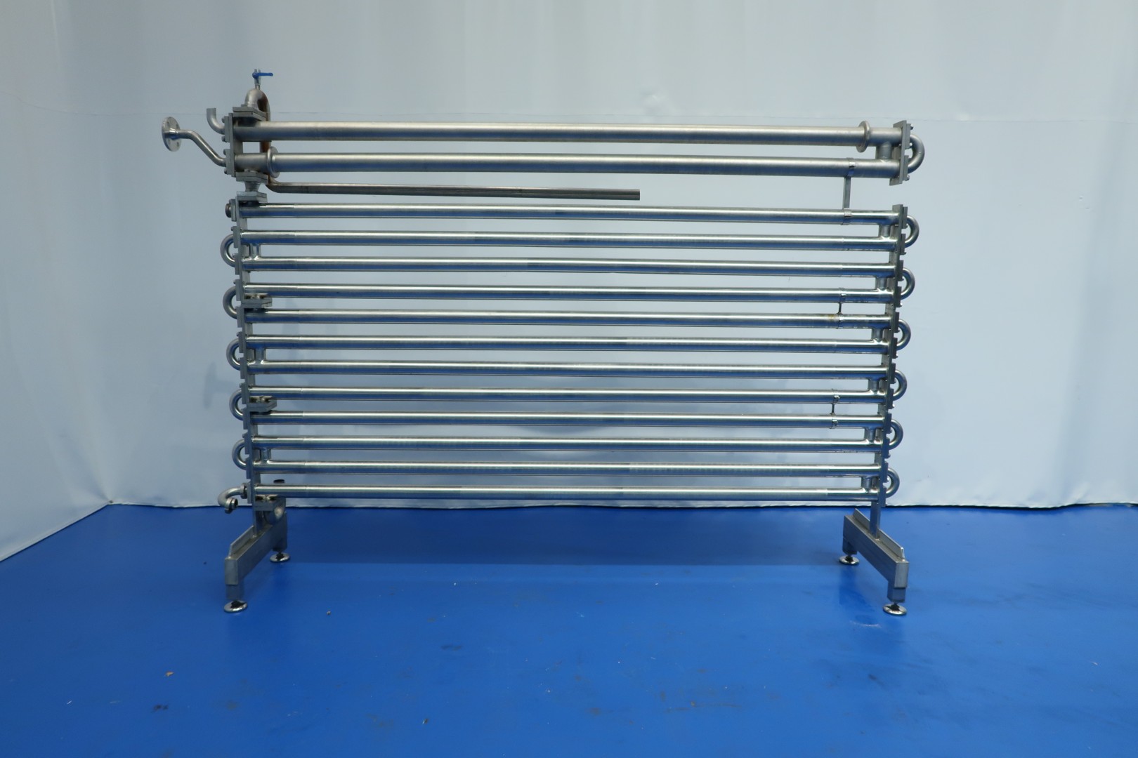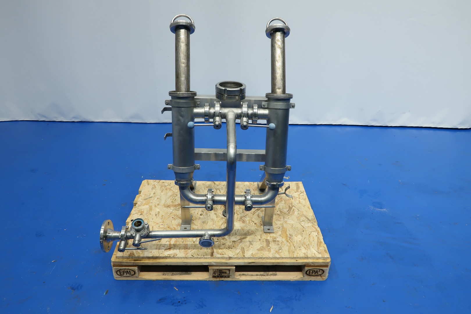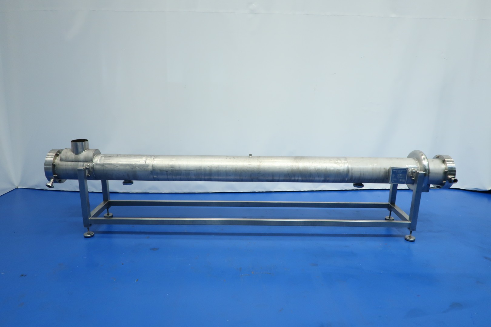 Heater unit with Direct steam injection (DSI) and flash cooling. previously used on milk concentrate 50%. Extreme fast heating and cooling of sensitive products. The Unit exist of: infeed (centrifugal pump Fristam 7,5kw, Tubular pre heater/air cooler (recuperation system), tubular heater by steam/hotwater indirect to ± 80°C, Steam injection direct in the product (heating up to between 90°C or max 145°C), capacity depending op product and temperature range and flash vat to cool product down by vacuum), oufeed pump (Fristam 7,5kW with flushed seal and double filter. The steam is filtered before injected by a steam filter (make Pal). with water pump, product and steam valves and piping. (excluding liquid ring vacuumpump and controls) can be offered on request.
