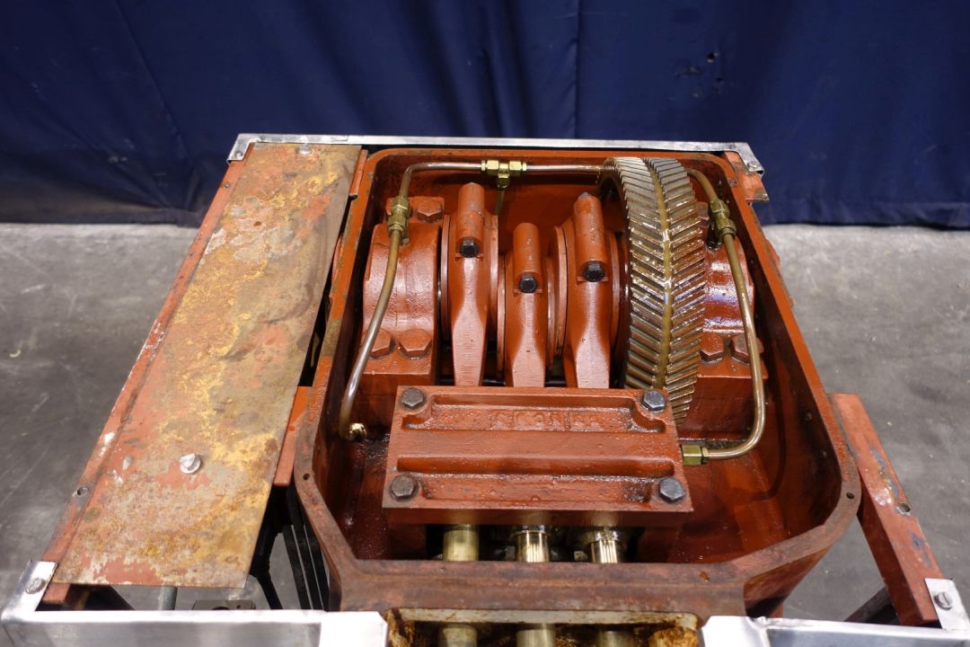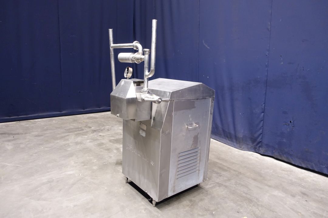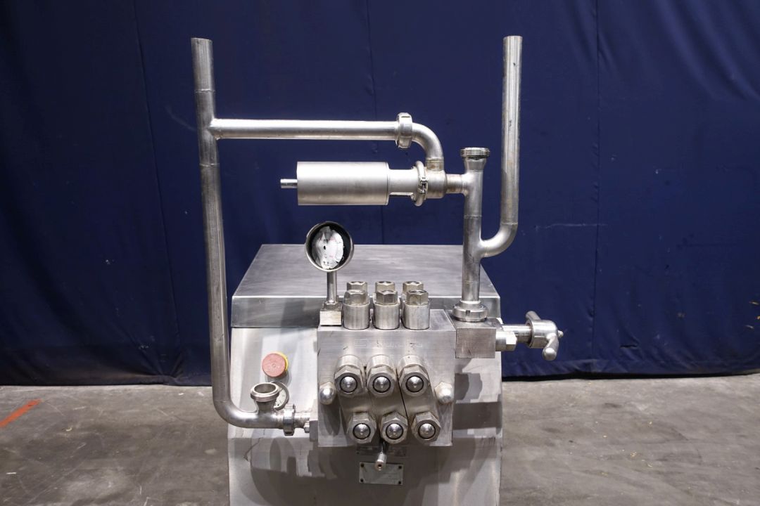 High pressure homogeniser. 1 stage with manual pressure control. 3 Pistons, piston diameter: 32 mm. Stainless steel cladded. Connections: 2" SMS. Current motor power: 7,5 kW - 15,8 A - 1445 rpm - 50 Hz. oil circulation pump. Maximum pressure in current confirguration with this motor 140 bar. (max capacity up to 1,600ltr with 1-7/16"pistons = 36mm) Pressure indicator Manometer (damaged). pneumatic Bypass/overpressure valve . Excluding: control panel. Total dimensions: 100 x 80 x 150 cm. Weight 690kg.