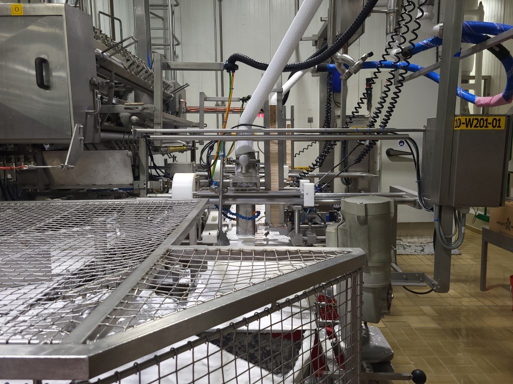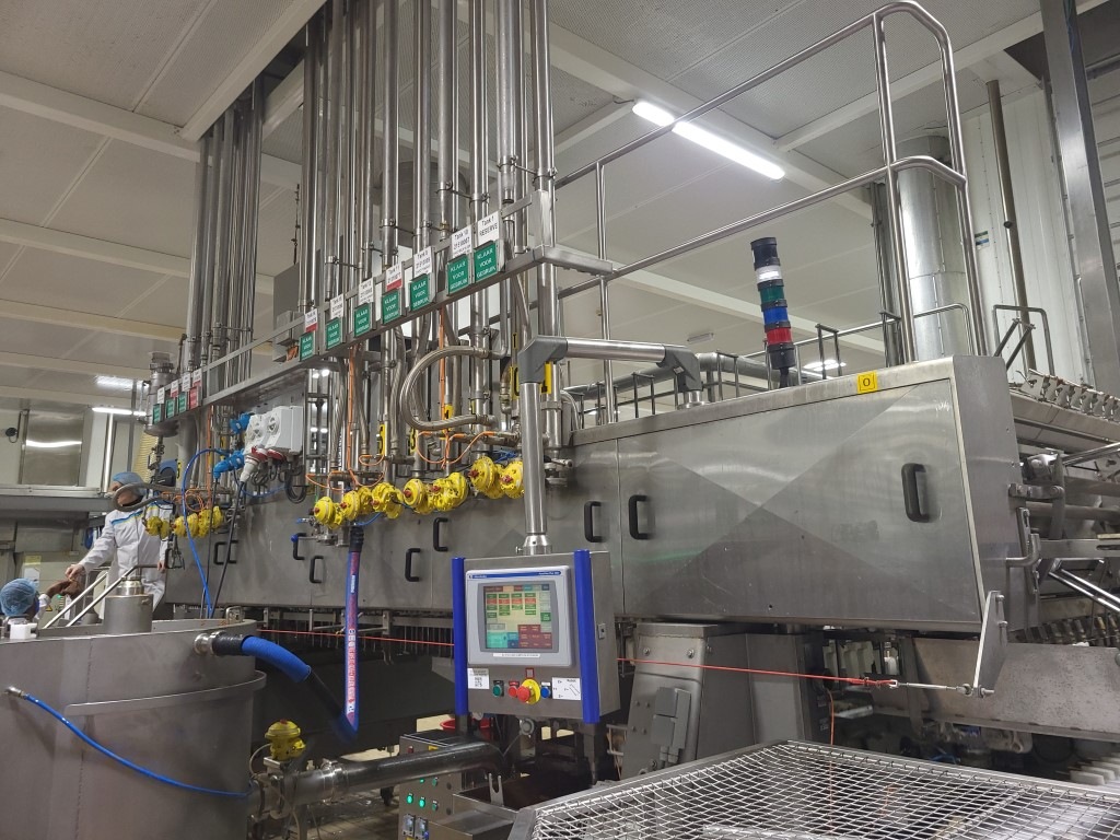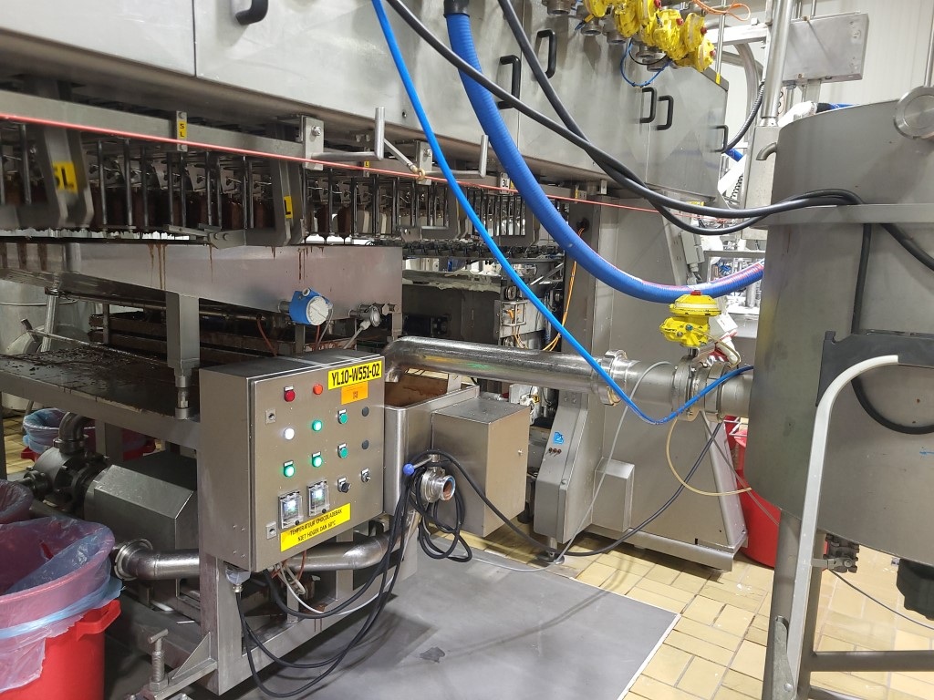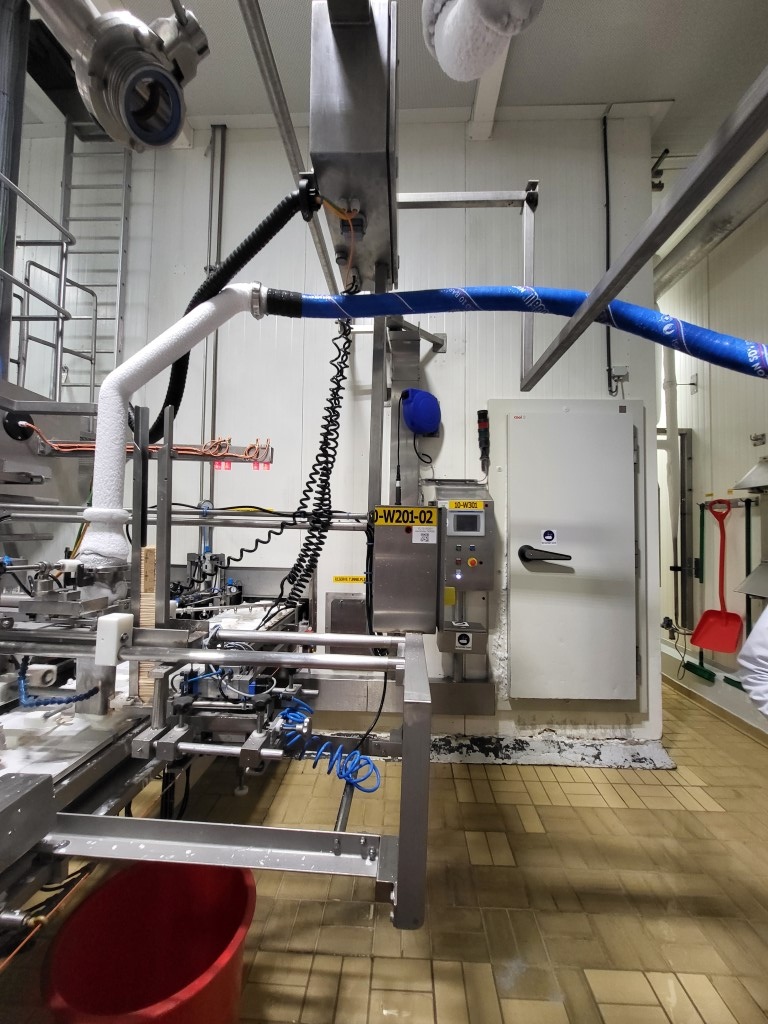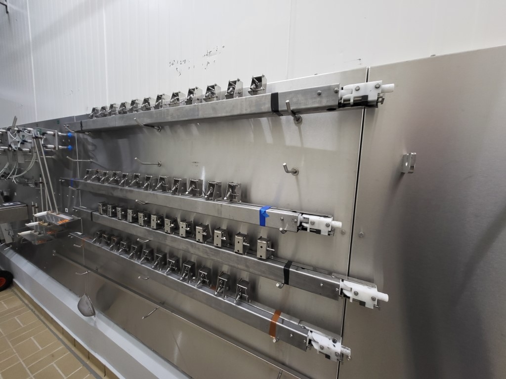 Ice cream stick “Magnum” extrusion and packaging line Line exists out of: (2-lanes extruder) for “Magnum” type ice cream with a wooden stick, product transfer device (12x2), chocolate dipping system(12-lanes) Multi dip station with 3 dips nitrogen en 2 dips fruit juice (for Solero production). You can also produce chocolate dip with a separate dip tanks APV freezing tunnel: Conveyor with plates which runs under the extruder into the freezing tunnel (and back), cooling capacity 175kW / 750 plates. Multi-lane flow wrapper (6-lanes), collection conveyor with dividers (1 by 1), conveyors with corner, empty (not successful package) foil suction device, manual preparation for packer (3,4 or 6 pieces) with 3 format sets. Cama cartoniser 2016 including Nordson ProBlu 7 hot glue device. Current workable speed of the complete line, 14.000 packed ice creams per hour, due to manual loading of the box. Line can produce up to 18.000 pieces per hour). Excluded in the offer: Continuous Ice Cream Freezer, check weigher, metal detector and shrink foil machine."