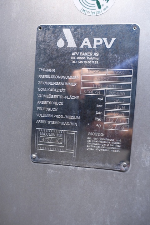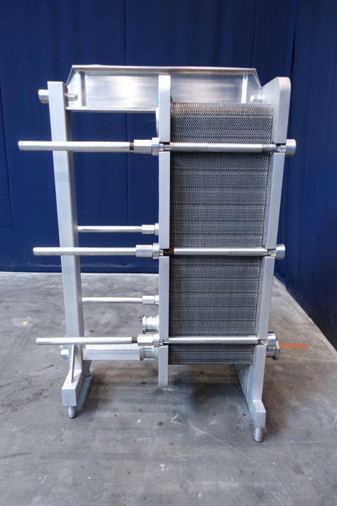 Plate heat exchanger, sanitary (PHE). Pressure: 10 bar, Beam length: 147,5 cm, connections: 4x4" DIN. Currenct configuration: 1 Section: 105 plates - Connections head: 2 down, follower 2 down. Dimensions: 130x80x193 (lxwxh) cm, weight: 1.355 kg's.