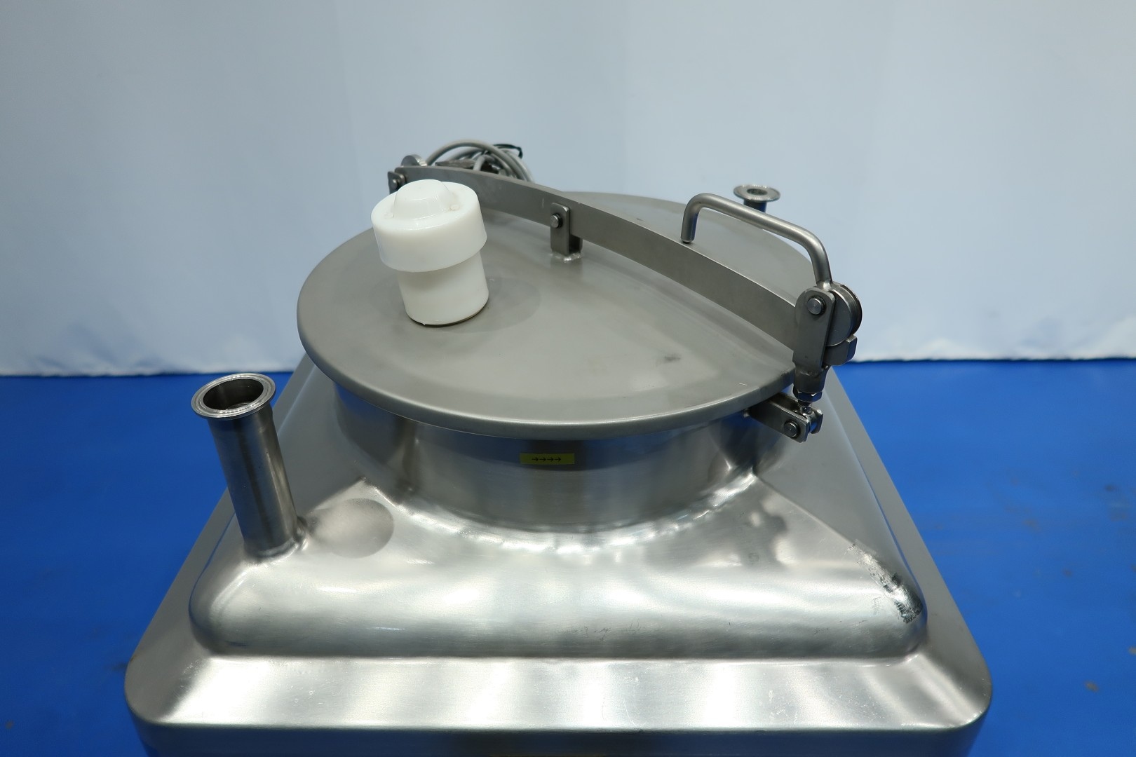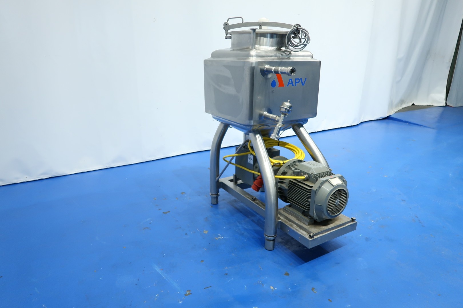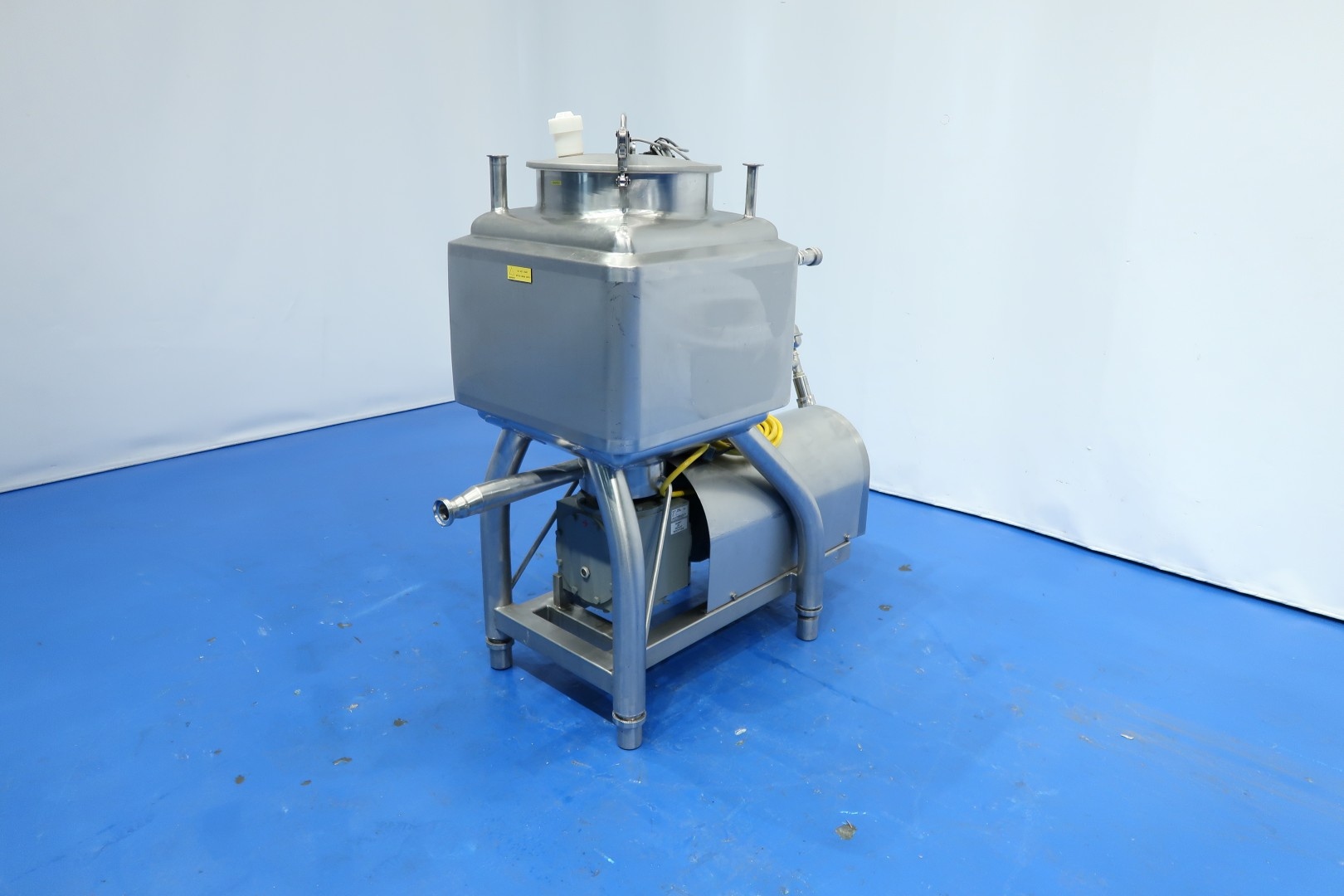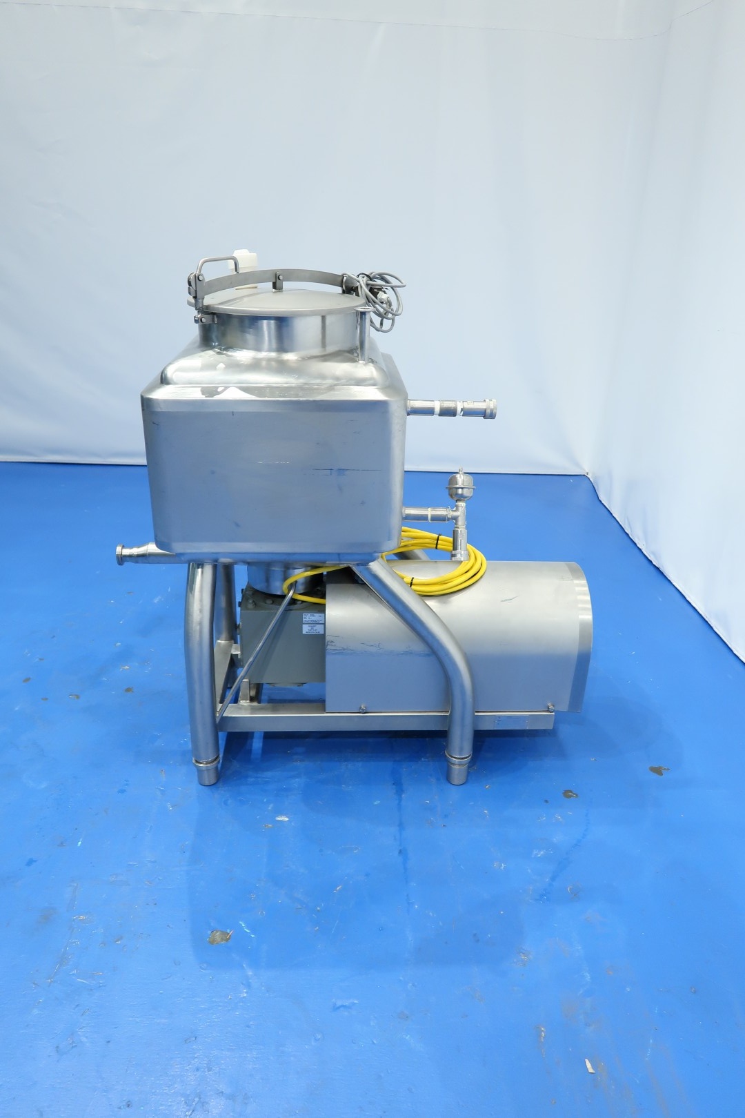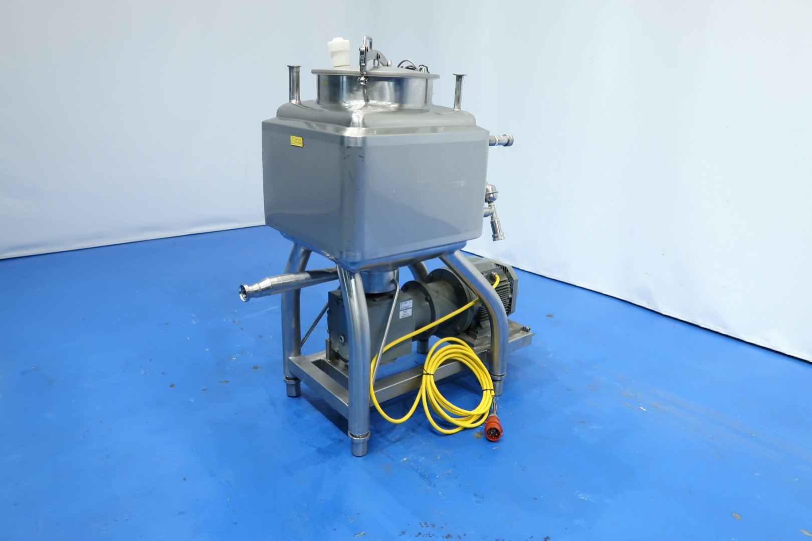 Liquiverter on SS frame with 4 x adjustable feet. Tank volume: 150 liter, double jacketed, 1x 1,5" Tryclamp connection (liquid ingrediënts inlet) for product. 1x 1" Tryclamp connection for Cip-spray bowl. Outlet connection 1 x DN40 Din. Jacket with 2x quick connect coupling, Manhole in top round Ø 40 cm with safety sensor - breather in lid. Motor: 7,5 kW - 15,3 A - 1.450 rpm, impellor size: 210 mm diameter. Inner dimensions: 55x55x55 cm. Outletheight 57 cm. Testmovie available. Total dimensions: 135x65x145 (lxwxh) cm - weight: 216 kg.