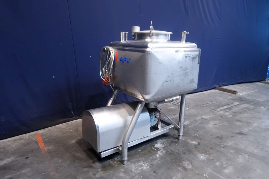 Liquiverter. Tank volume: 500 ltr. Double jacketed (slight explosion damage on jacket only not to inner tank). Spray bowl for CIP. Temperature indicator and manometer. Liquid ingrediënts inlet. Breather. Motor: 11 kW - 1.460 rpm. Total dimensions: 160 x 100 x 170 cm.
