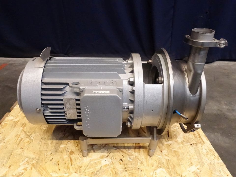Sanitary centrifugal pump. Current motor: 15 kW - 28 A - 2925 rpm. Impellor missing, pump head missing. Flushed seal. Connections: 3'' / DN50, Clamp.
