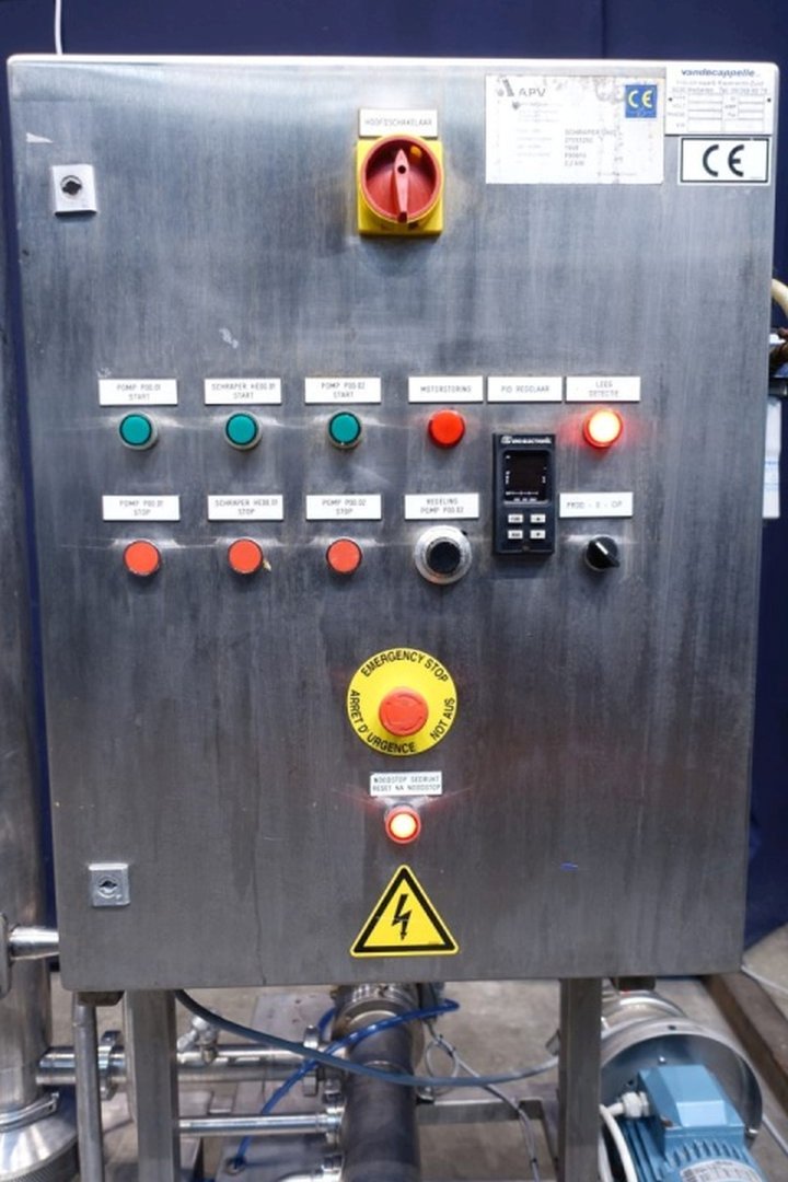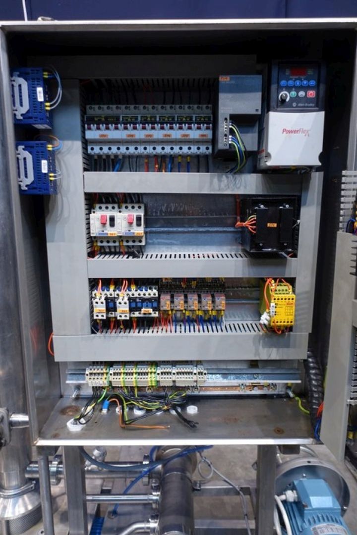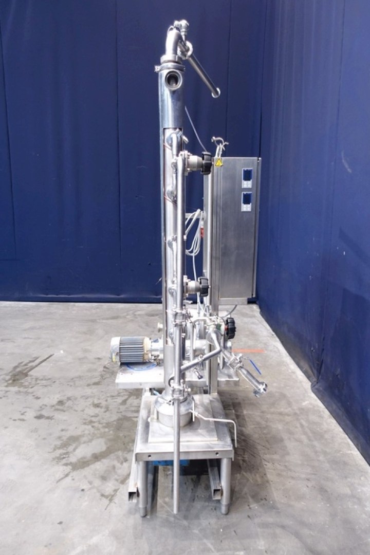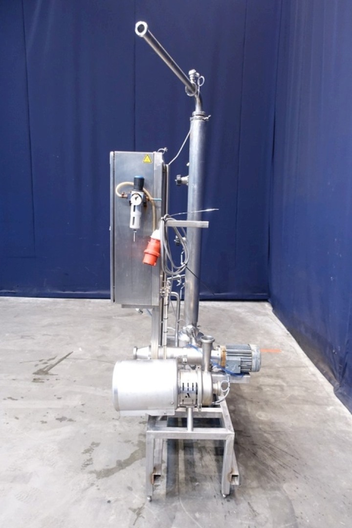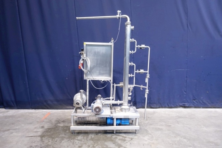 Inline cooker. A rotary pre blender with steam injectors and vertical product cylinder (former Scraped Surface Heat Exchanger). Tube: Ø 100 mm, length 1.368 mm, rotor with mixer blades. Volume vertical tube 9 ltr. Drive motor 2,2 kW. Product side: pressure 7 bar, temperature 150°C. Included simple control panel. Connections In: 2" Din and Out: 2" Din. Total dimensions: 160x80x236 (lxwxh) cm - weight: 282 kg. Manual valves for steam, pt-100 sensor on outlet. Function: heating inline of a pumpable product by steam injectors, can be fully autom