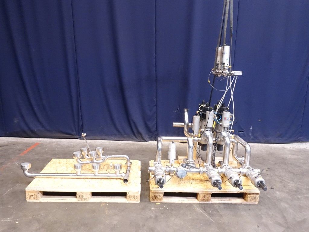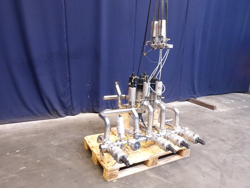4 x SW44 2,5''- 4 way single seat valves with SMS connections. 4x DAX33- 2,5'' - 4 way double seat mixproof, with seal lift. Weld-weld.