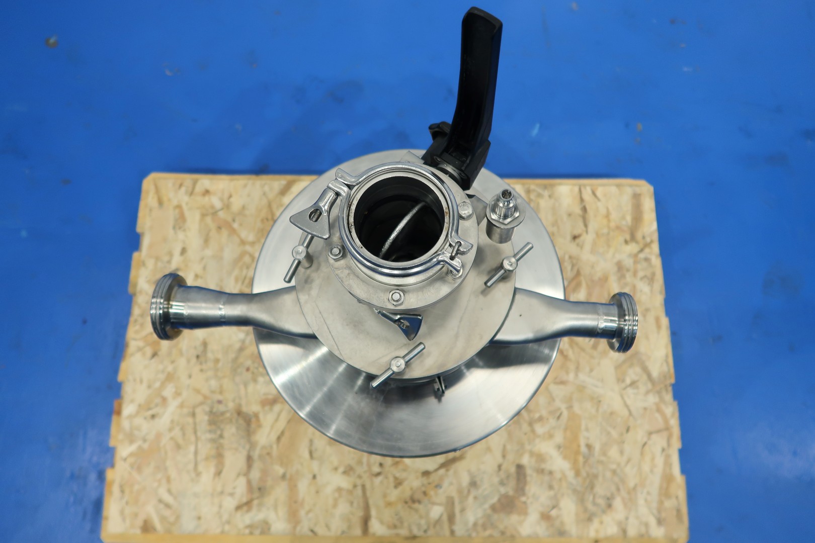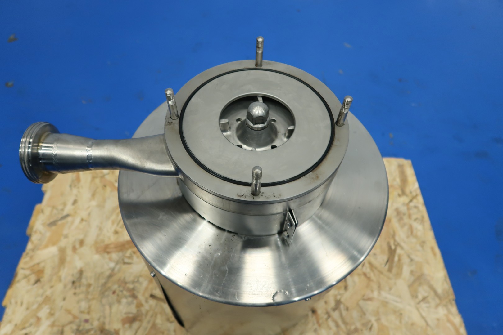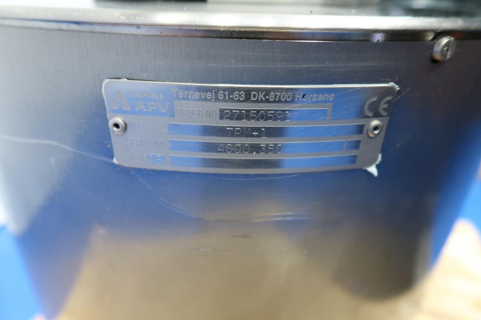 Powder dissolver with hopper with cover. Hopper volume ca. 100 liter. Order no. 27150591. Impellor size 170 mm. Motor: 7,5 kW - 13,9 rpm, 50 Hz - 2.915 rpm. With manual butterfly valve on infeed under hopper. The powder mixer can be used in any situation where powder is first added and then dissolved in liquid. Milk powder: 60 kg/min, whey powder: 75 kg/min, lactose: 150 kg/min and sugar: 130 kg/min. Connections: (in) 2" Din - (out) 1,5" Din. Dimensions: 80x80x140 (lxwxh) cm - weight: 120 kg.