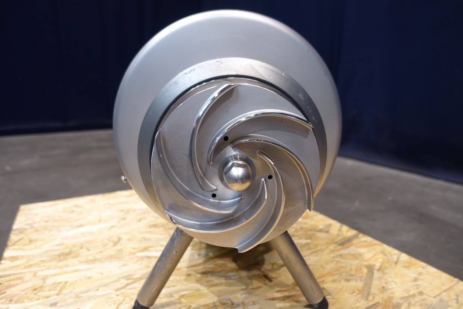 Sanitary centrifugal pump. No typeshield on motor. Impellor diameter: 180 mm. Order no.: 27140589. Connections: (in) 4" Din / (out) 4" Din. Dimensions: 61x36x50 (lxwxh) cm, weight: 90 kg's.