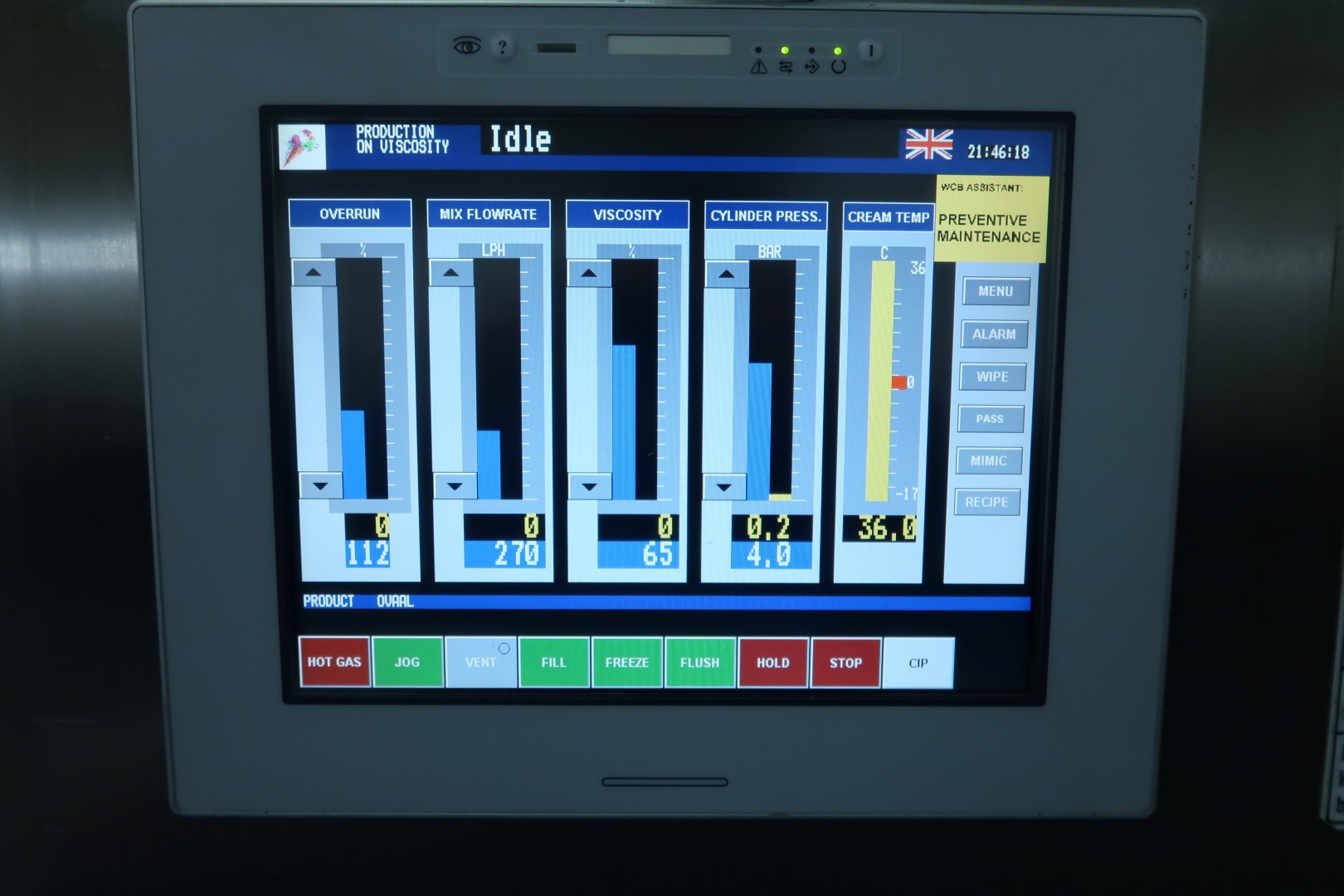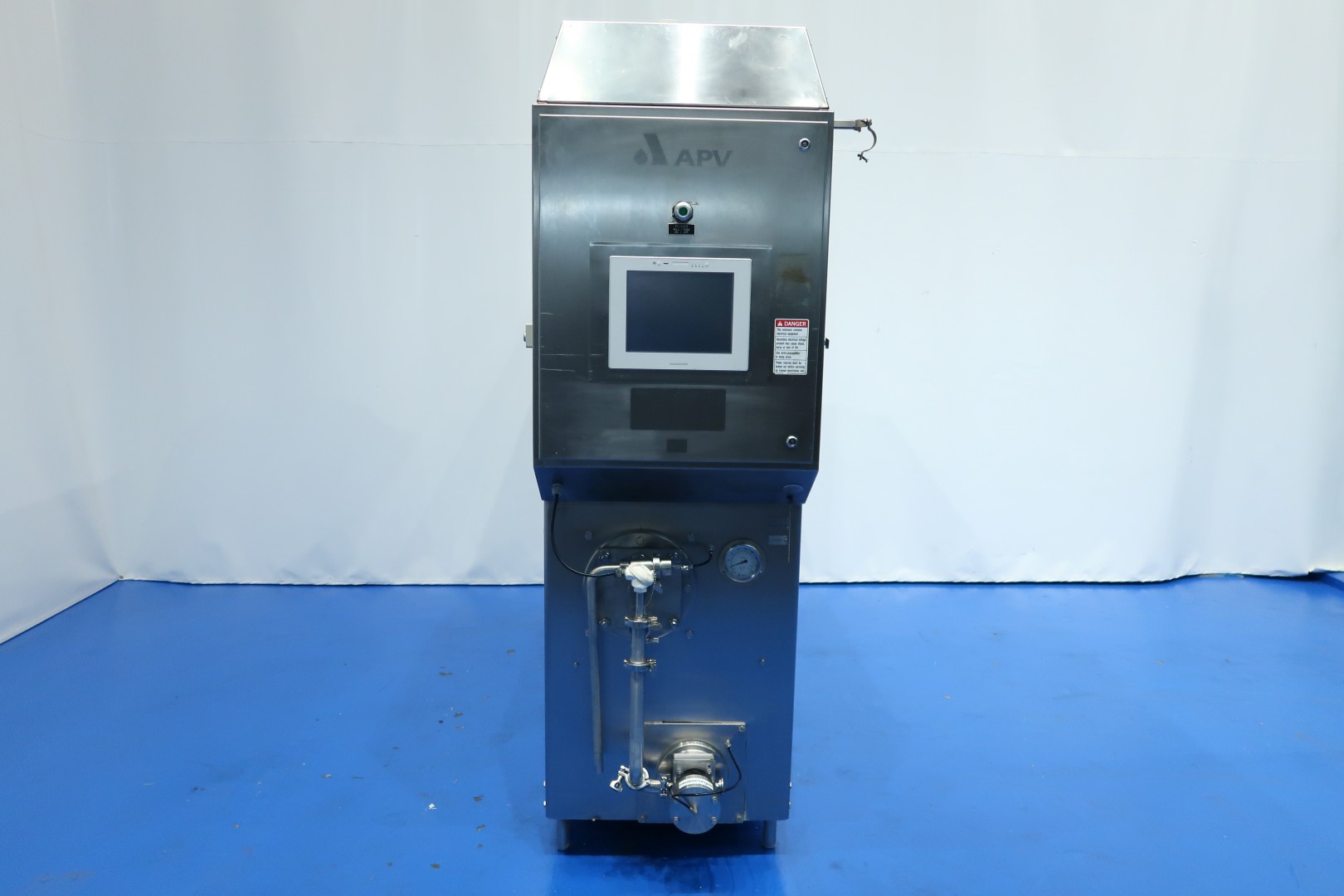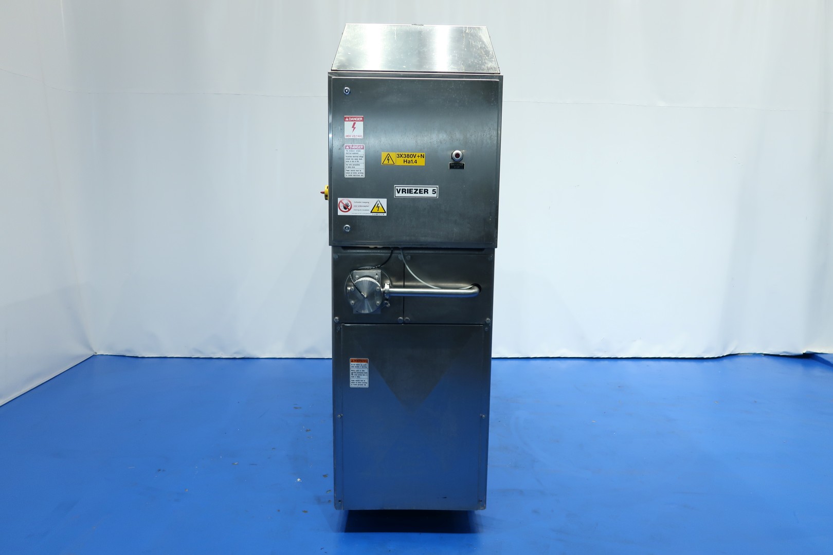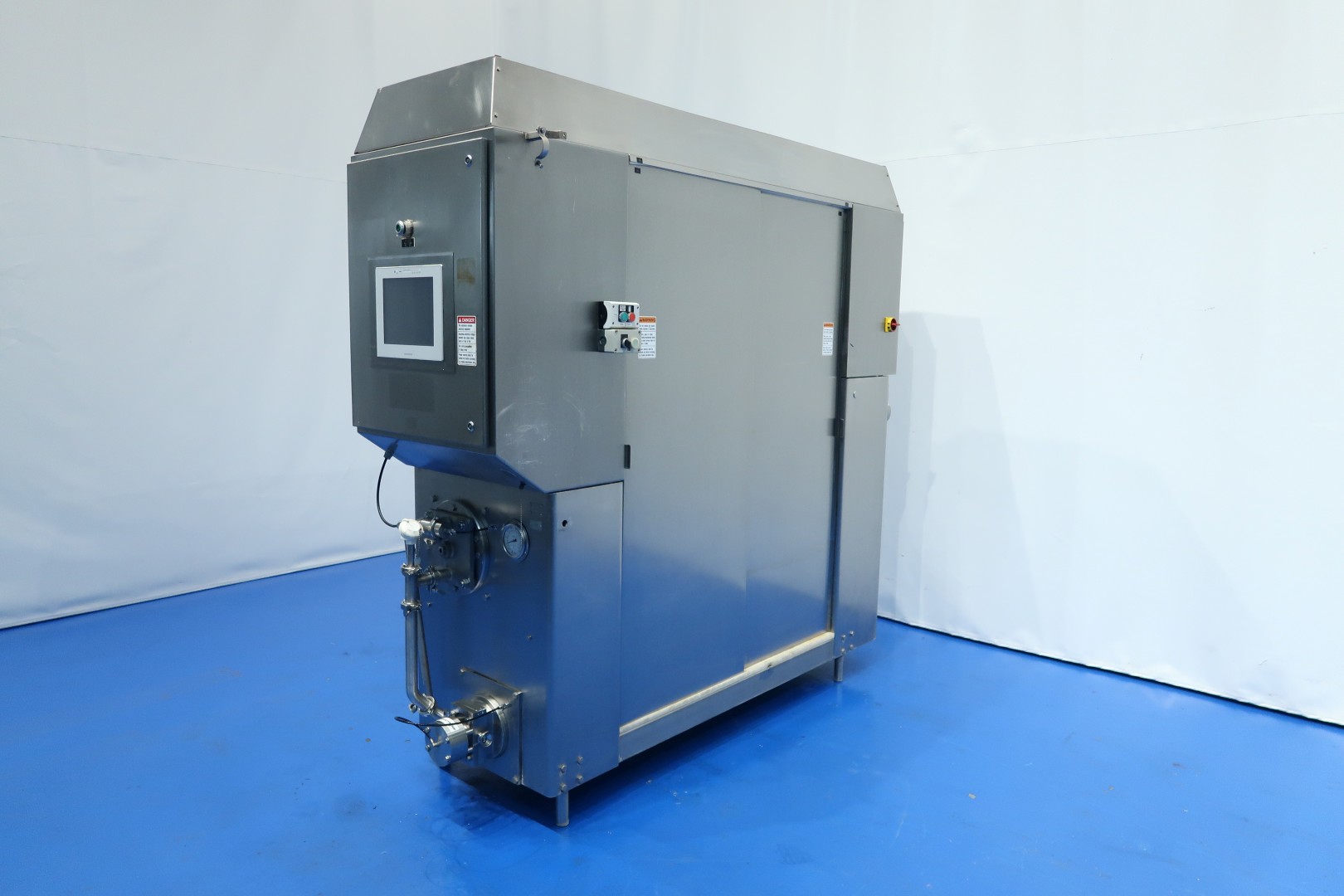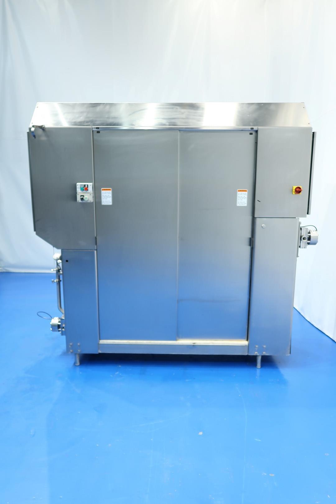 Continuous freezer for the production of ice cream . 1 Cylinder with new scrapers. System Amoniac (NH3) cooled. Pumps. Control panel on machine with PLC (Siemens Simatic S7) with Touch screen operation panel. Recent maintenance to dasher/cilinder and pumps (information available). Connections: productpump in/out 2" Tryclamp - mix pump in/out 1,5" Tryclamp. Documentation available. Capacity: 800ltr/h mix input and with up to 100% overrun 1.600ltr icecream on output. Dimensions: 240x80x230 (lxwxh) cm - weight: 1.153 kg.