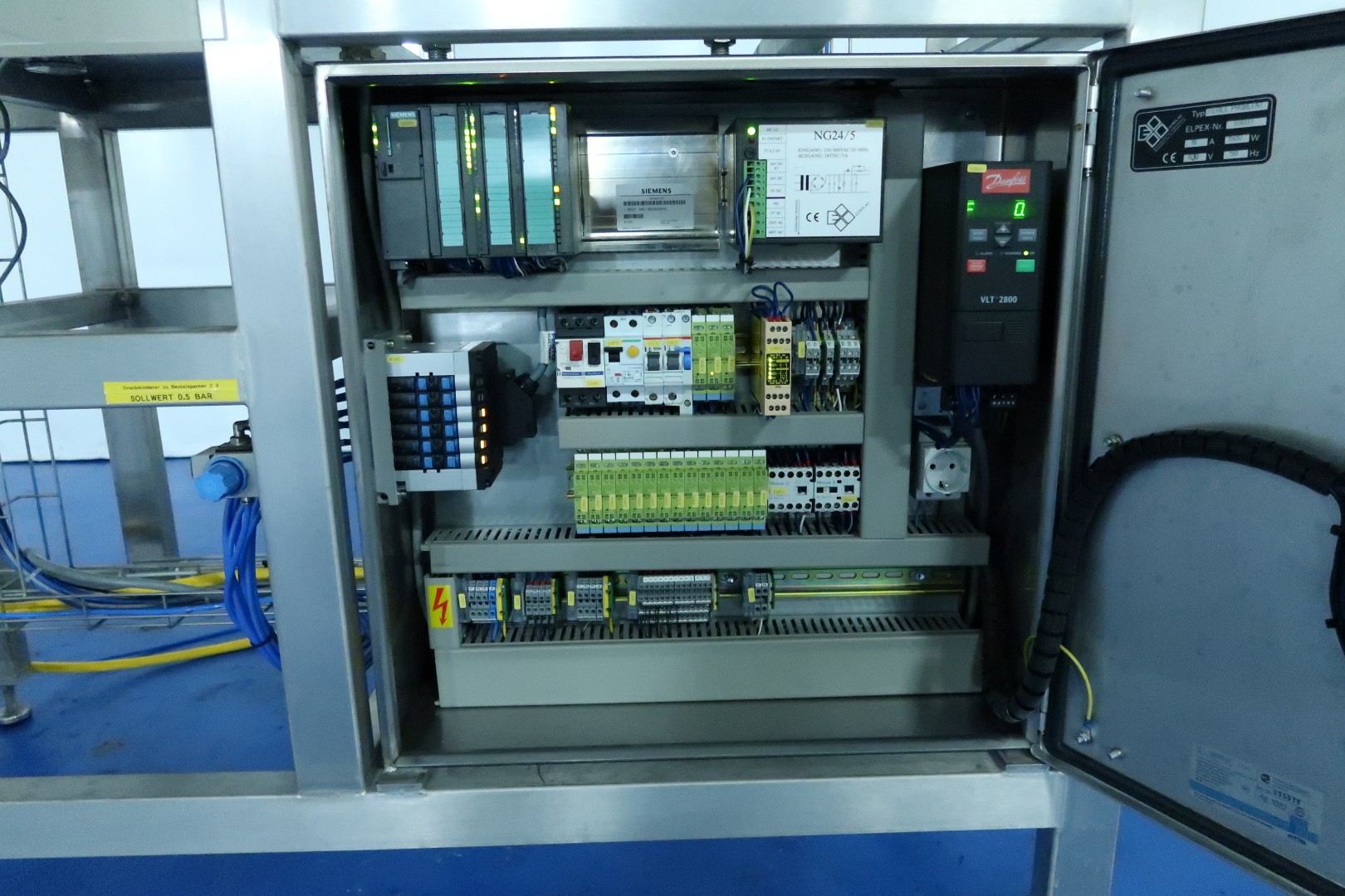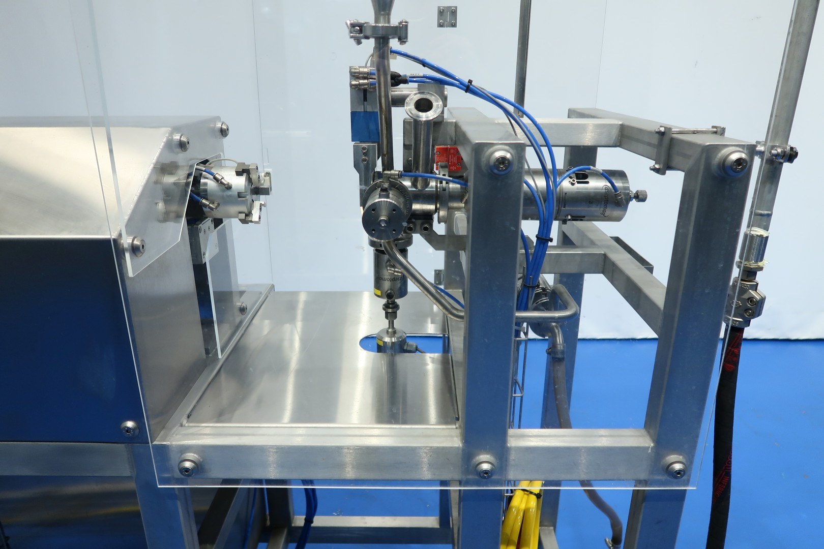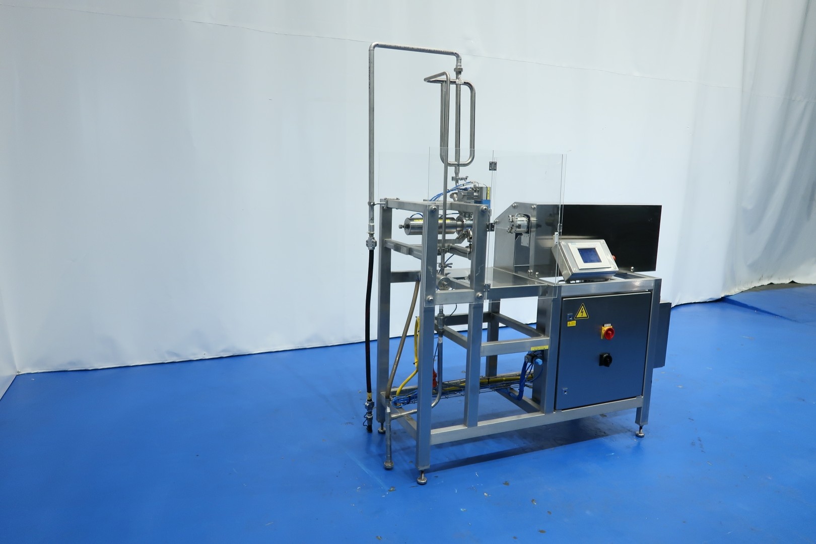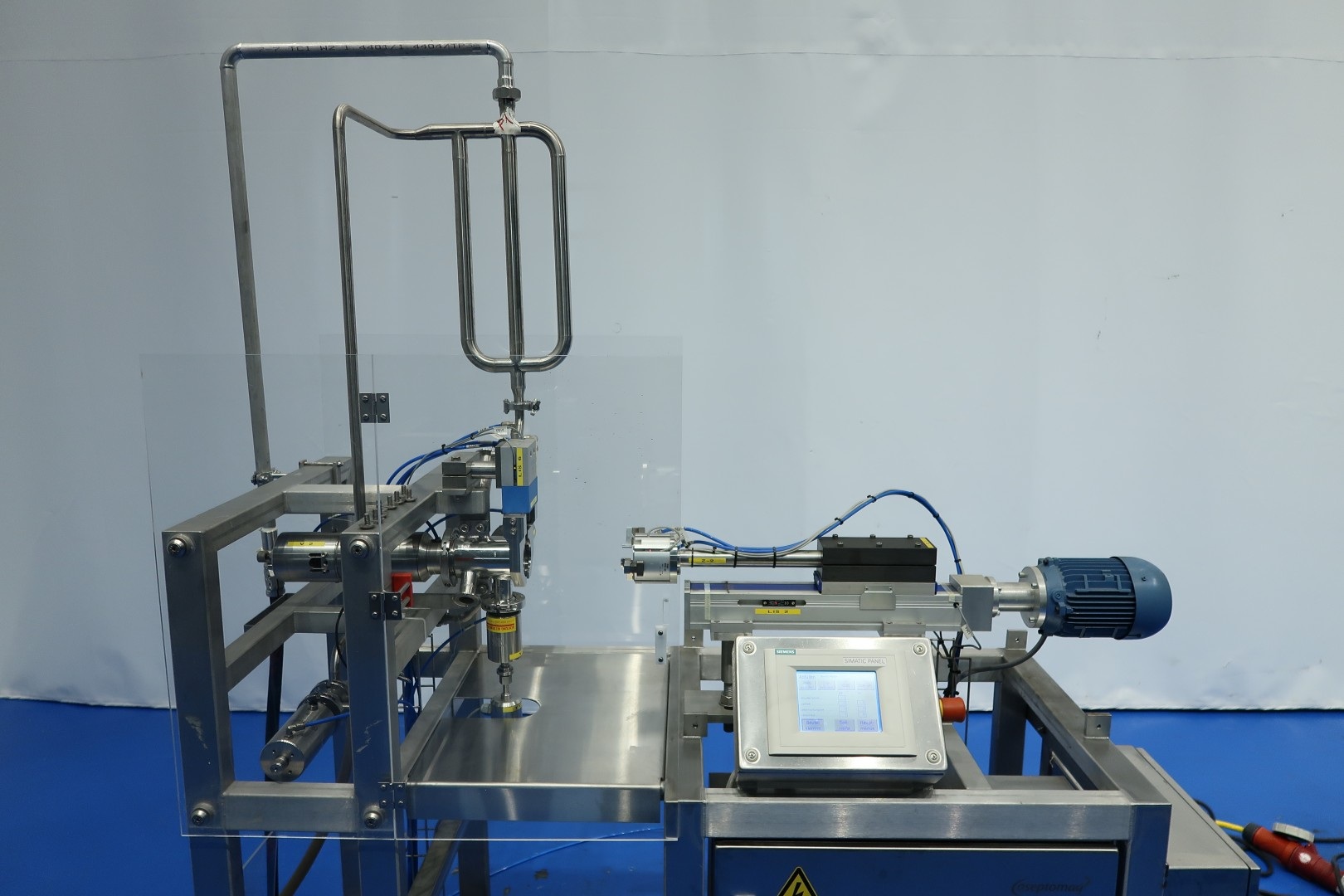 Aseptic sample taking machine, inline, Contols: Siemens Simatic S7-300 with touch panel. Plexiglass with safety sensors. Can be operated manually or autmatic (with entered parameters of sterilisation time, etc). Total dimensions: 177x65x210 (lxwxh) cm - weight: 170 kg.