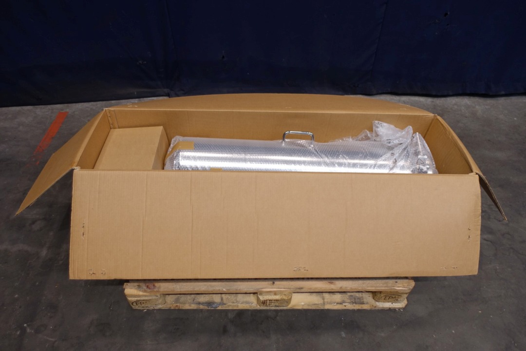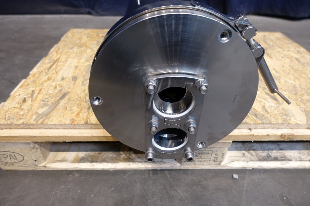 Vertical filter housing, unused, in original packaging. Including insert with a diameter of 56,22 mm. Diameter on top 270 mm. Length filter house 133 cm. Sanitairy for liquids. Volume: 63,9 Ltr. Connections 1x 1,5" Try clamp and 2 x pipe Ø 78 mm.Only housing, excluding filters. Dimensions: 50x50x160 (lxwxh) - 79 kg.