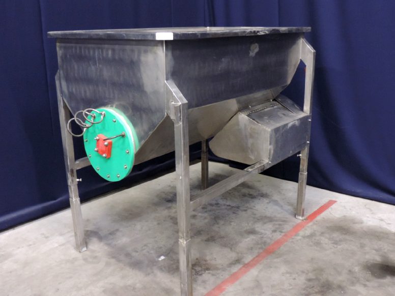 Ribbon blender, horizontal situated, single jacketed, manual cleanable. Ribbon auger length 33 cm - diameter Ø 30,5 cm. Motor power: 2 -5 kW with reductor. Outlet manually removable, outlet diameter Ø 30,5 cm. Ingredient input manually via the top. Dimensions product room lxwxh: 130 cm x 90 cm x 60 cm. 4x legs in heigth adjustable. External dimsenions lxwxh: 167 cm x 107 cm x 156 cm.