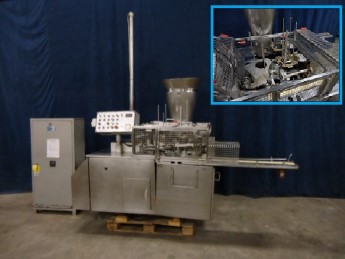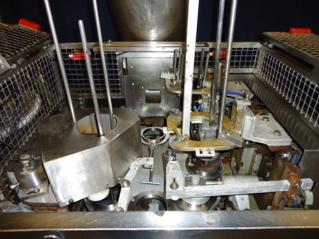 Rotary filler with 1 head, Special for viscose products, with hopper stainless steel hopper, Destacking, cupdetection by fotocell, Filling by piston pump (stainless steel housing) manual cleaning, 150-250ml, sealing and snapcap. To outfeed conveyor, current format size: round Cup diameter 116mm. Format change on request, electric part already taken off, Robust full mechanical filler needs a rebuild. Speed with sealing 60/min without sealing up to 80/min. Can be converterted to direct link-up with compensator for butter or Margarine.