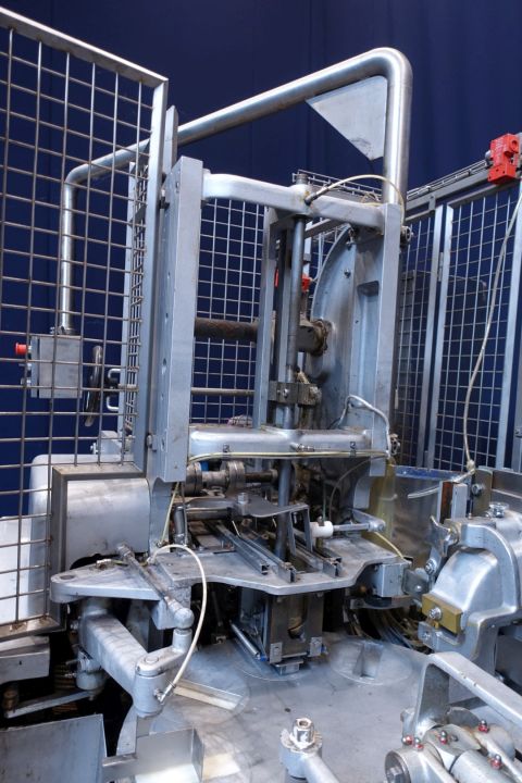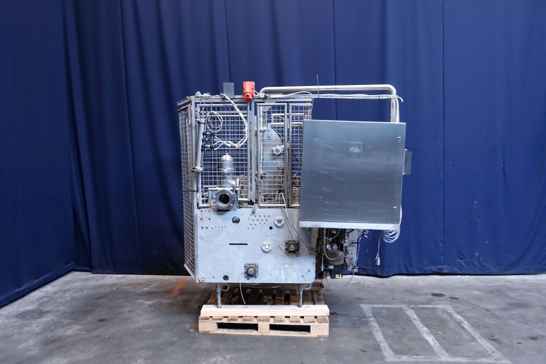 Fully automatic filling and wrapping machine for butter in aluminum foil or parchment paper. Product feed by direct link up. Photo cell for print centring device (paper correction by spot mark). Central greasing system. Excluding compensator, liniair potention meter to control a feed pump, date coder or outfeed conveyor. Format set on this machine: stick pack, 125 gram, ± 125 x 35 x 32 mm. Control panel with PLC control. Total dimensions: 210 x 145 x 230 cm.