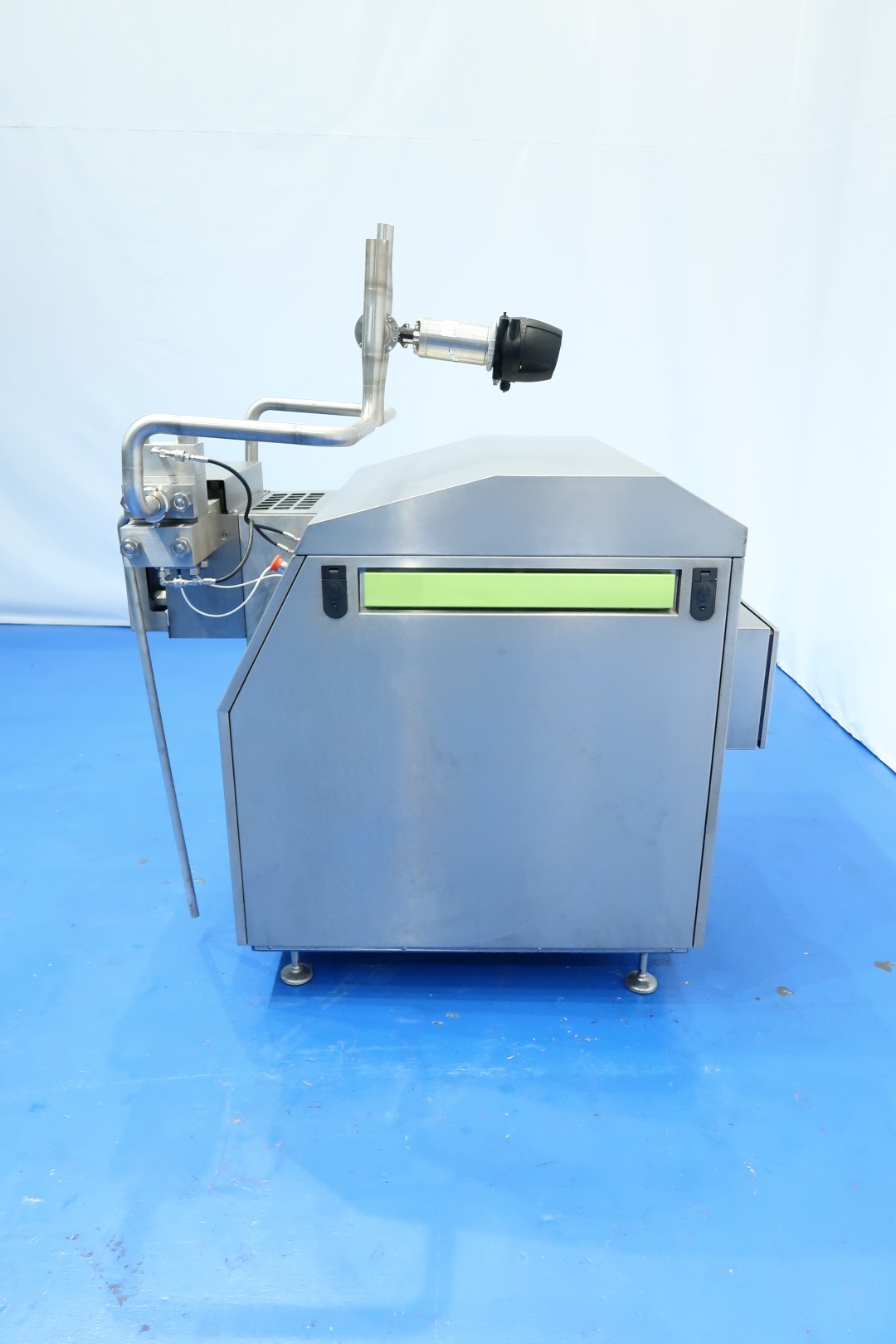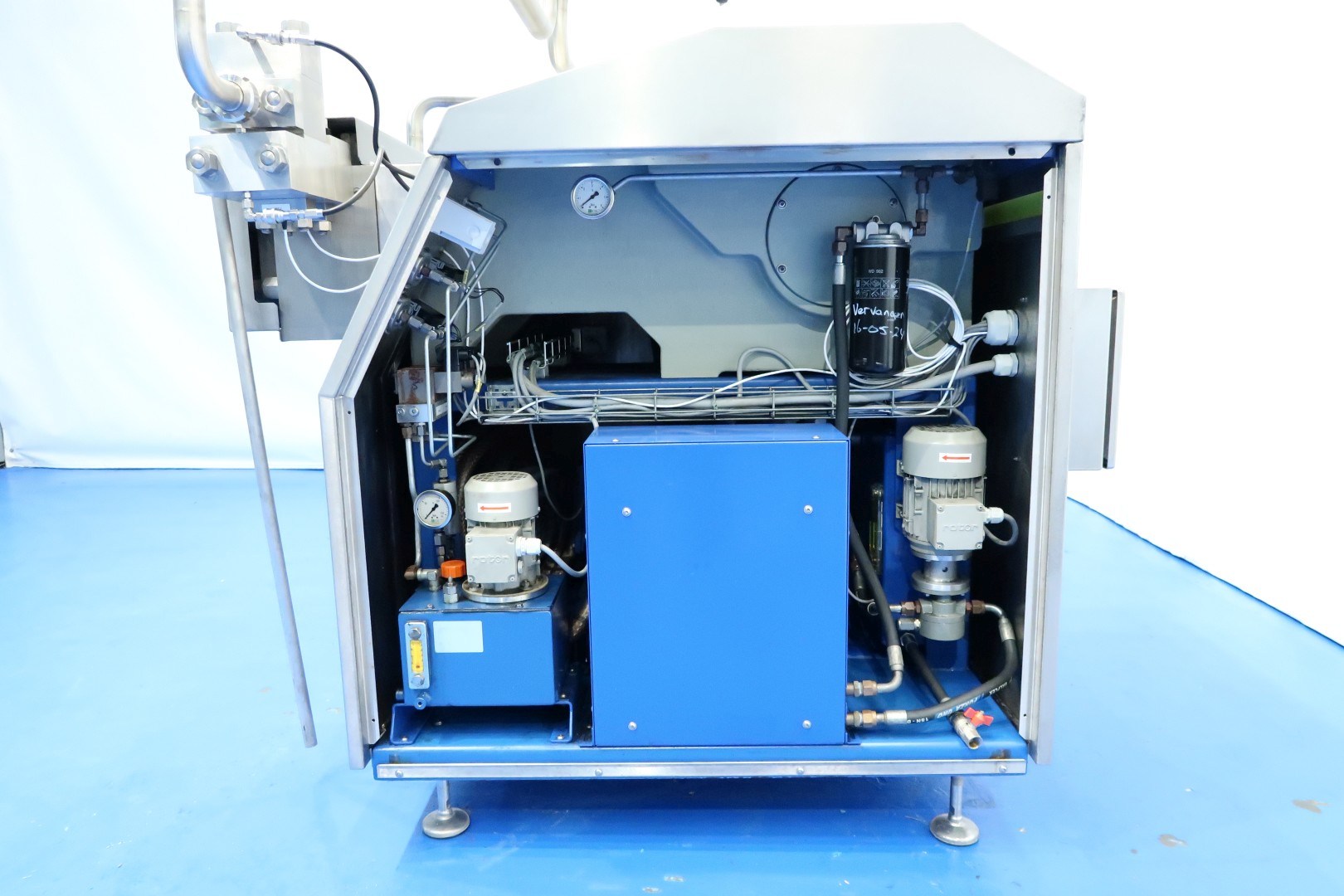 High pressure homogeniser. 2 Stages with hydraulic pressure control. 3 Ceramic Pistons, piston diameter: 32 mm and stroke: 95 mm. Ball valves for viscose products. Connections: (in) 2" Din and (out) 2" Din. Current motor power: 30 kW and maximum pressure in current configuration with this motor up to 400 bar. Freestanding control panel (with Danfoss frequency converter). Set tools. Overpressure valve (480 bar). With Gea bypass valve. Manometer on first and second stage. 2 x Electronic pressure transmitter. Flowswitch on cooling water. Remote pressure control. Documentation available. Total dimensions: 155x115x177 (lxwxh) cm - weight: ca. 1.235 kg.
