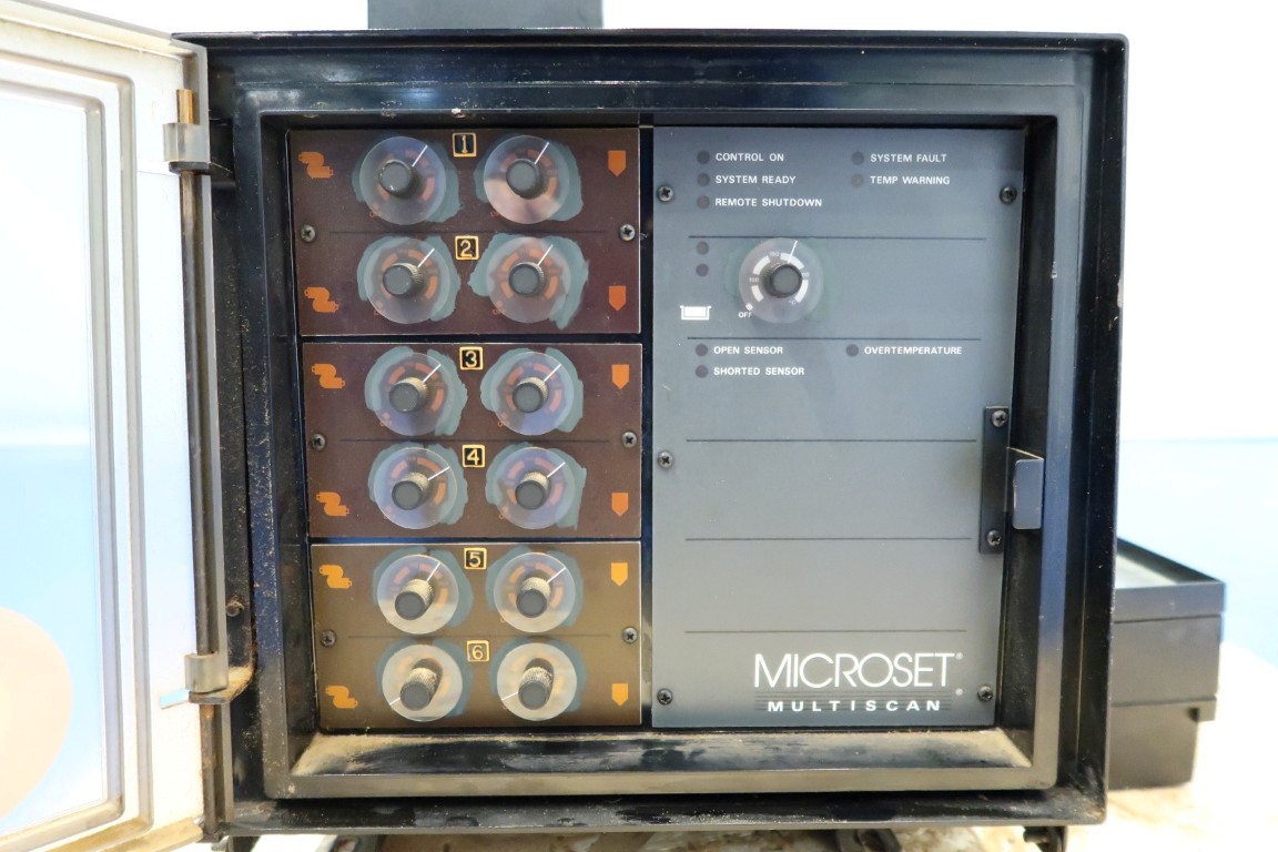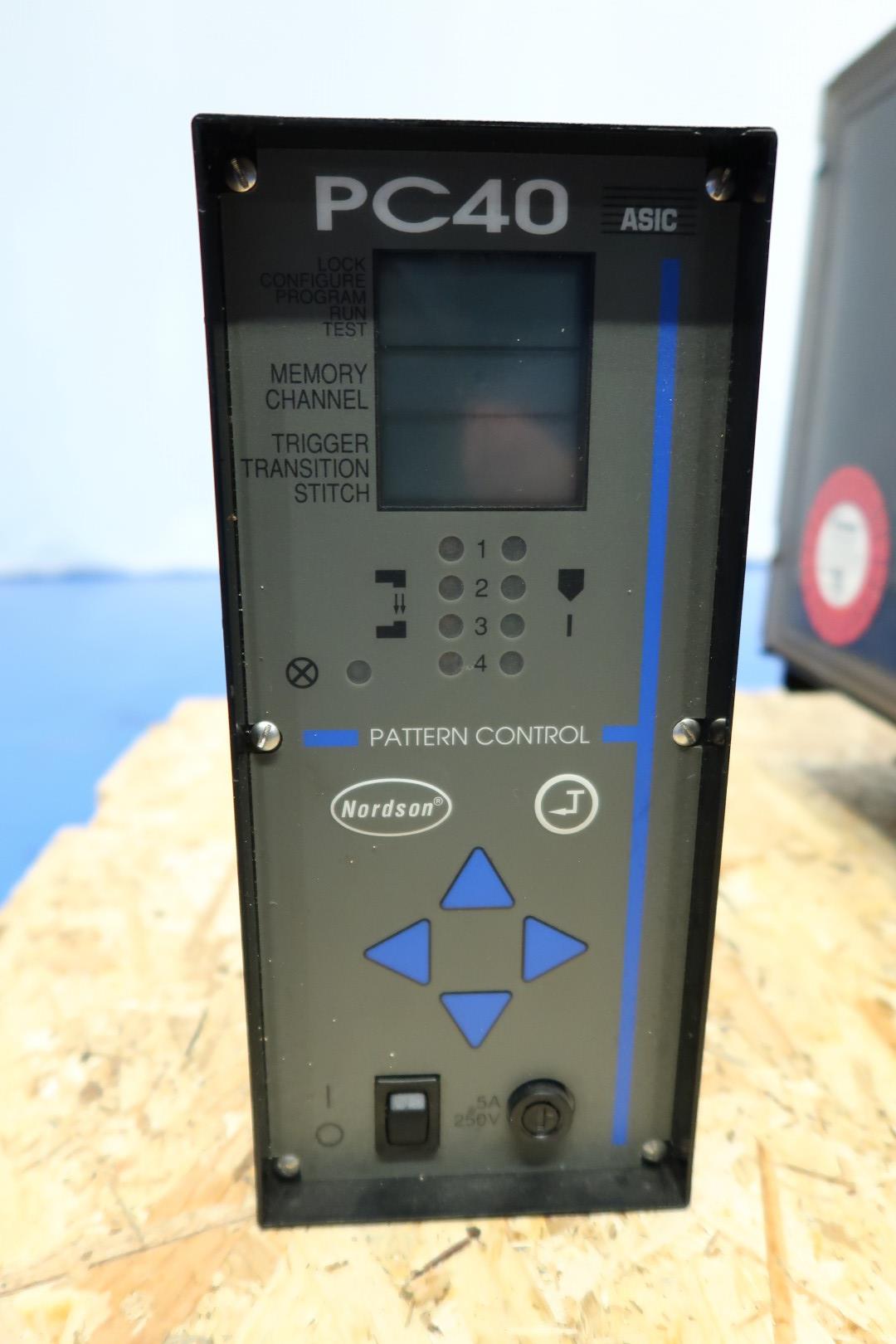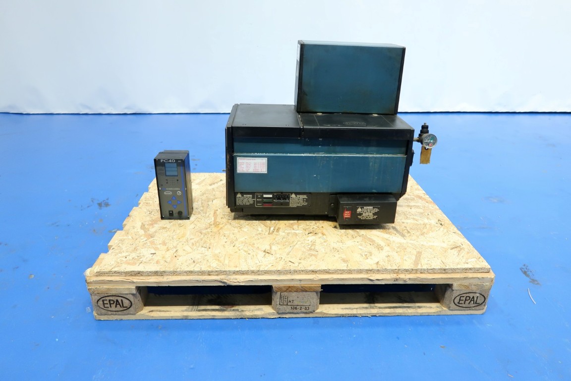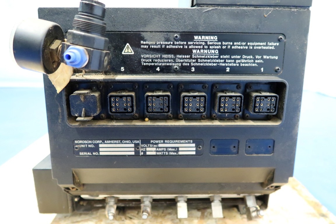 Hotmelt unit with 5 outgoing hosepoints. Each outgoing glue feed can manually be adjusted. Temperature adjustable. Glue compartment: pressure 3,5 bar – temperature 150°C. Hose: pressure 4 bar – temperature 160°C. Microset Multiscan controls. With Nordson PC40 pattern controller/timer. Unit No. 3500 – 2AB36/A. Dimensions: 59x40x59 (lxwxh) cm – weight: 62 kg.
