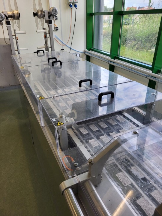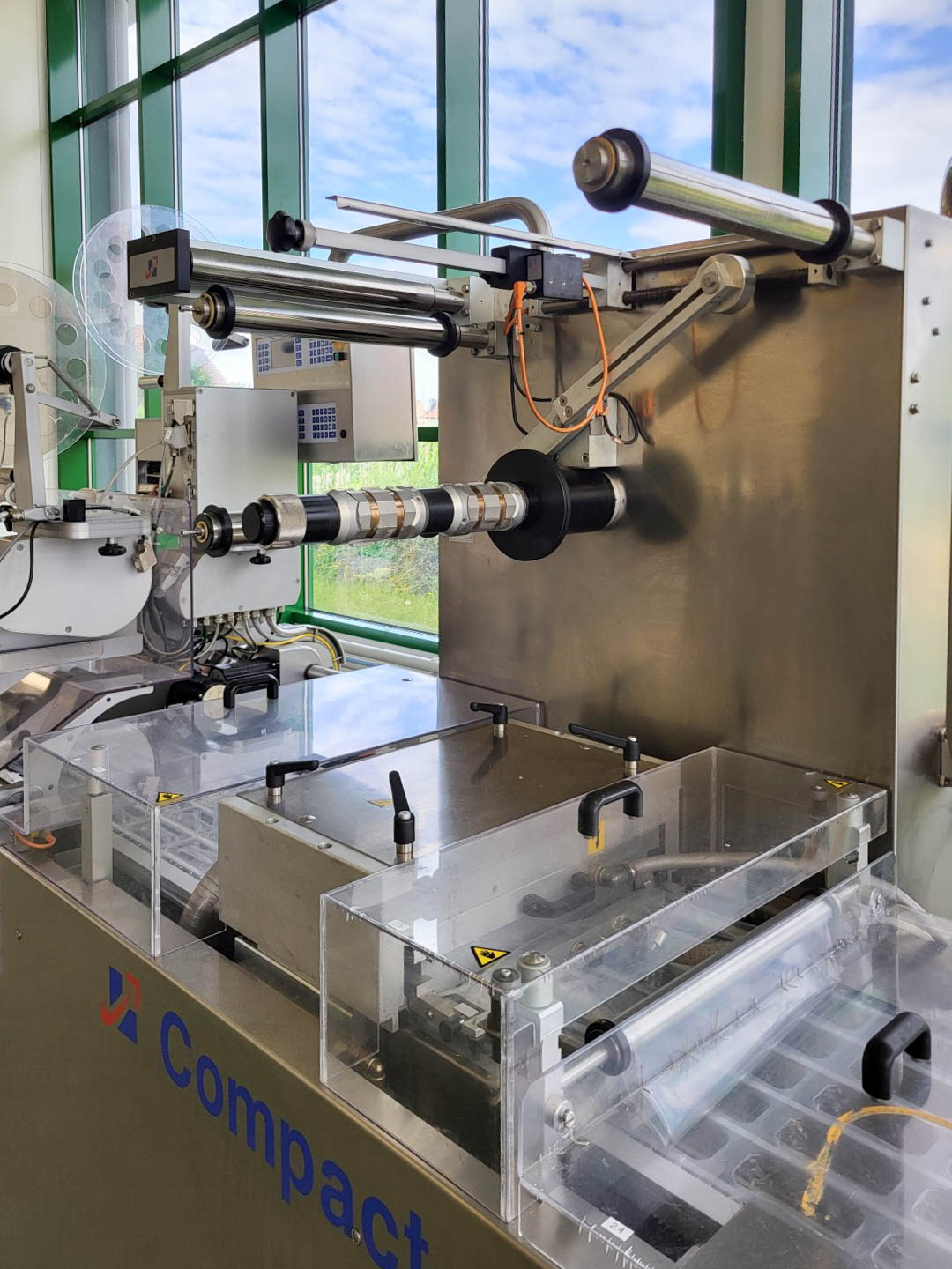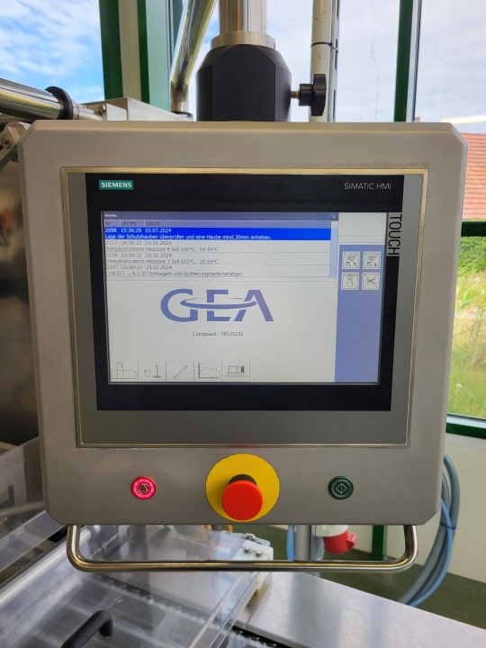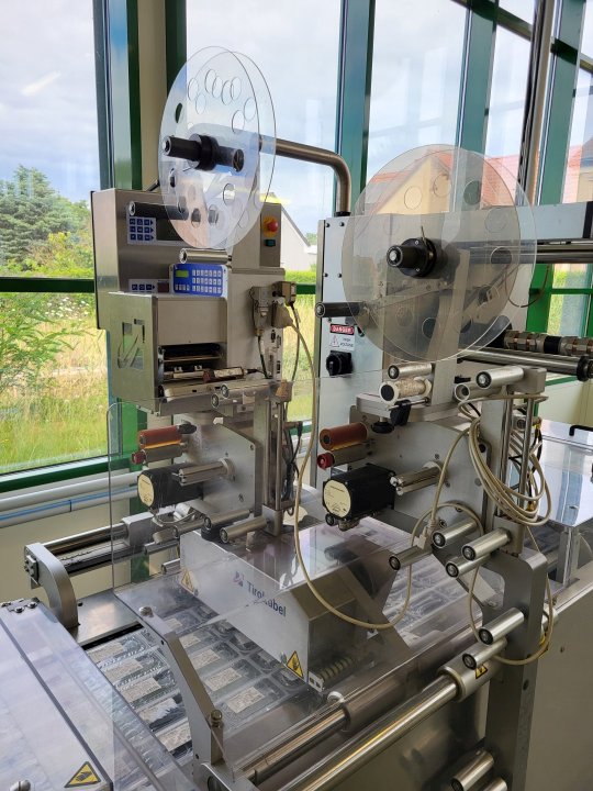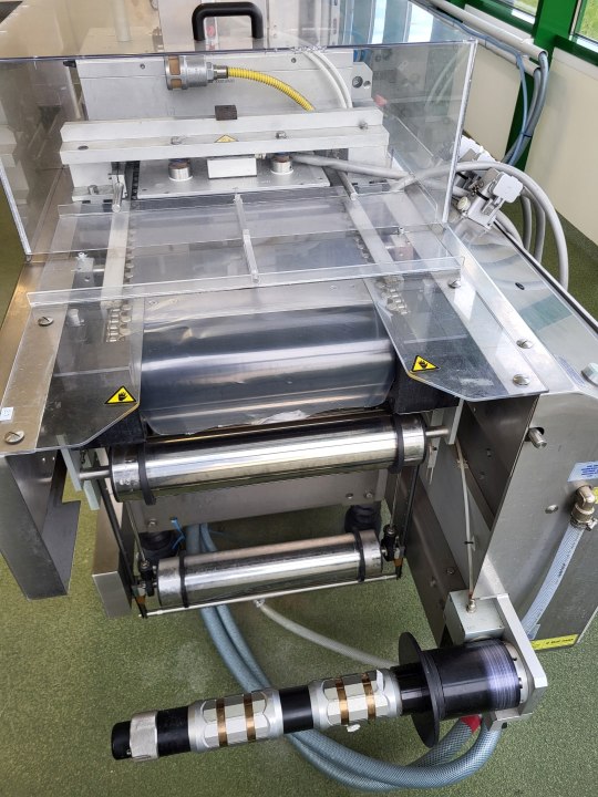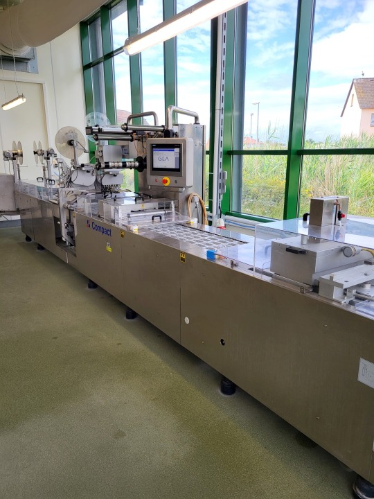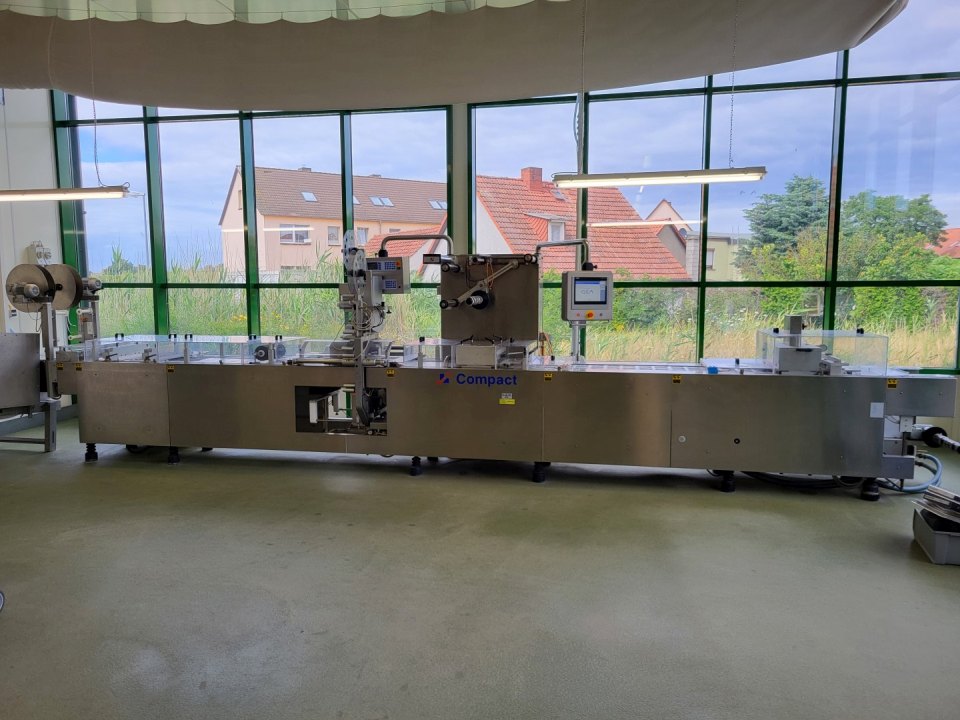 Thermoforming vacuumpackaging machine for both soft and hard foil, foil width: 360mm, foil thick 60 my, Form station up to 100 mm dept, Forming, empty space for filling (cheese), vacuum and sealing station, vacuum with pressure transmitter. under and top labelling Model TiroLabel, TL-100 nr 602/0675 Controls Siemens PLC S7 with Touch screen hmi Koeling device additional make: CFS model: SC 5 2, capacity 6kW (year) 2002 current format with 5 lines.- including roll holder for upper and lower web.- vacuum pump - gas flushing system - outfeed conveyor belt (Foil available on request). complete model: CFE Compact M380 2,11+10, electrics: 28kW, 40Ampere
