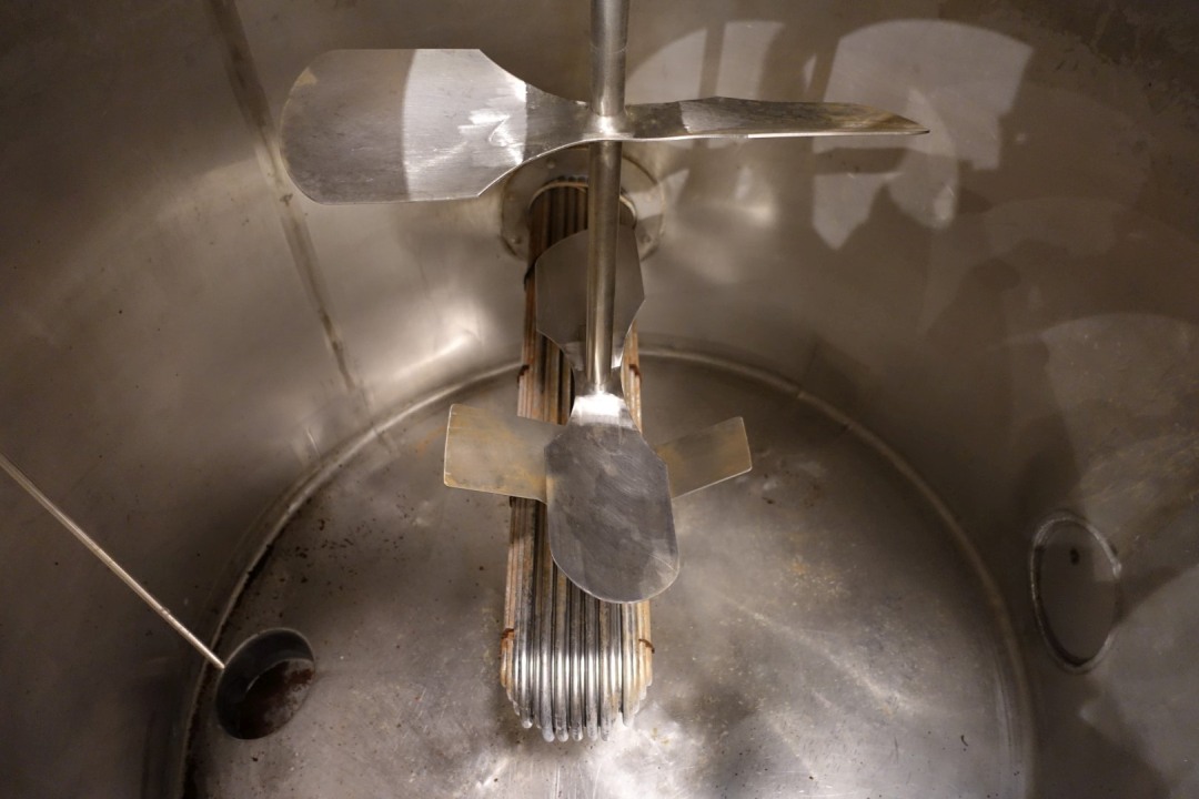 CIP tank with agitator and spiral tube heater inside the tank. Blade agitator - engine: 0,37 kW - 1,2 A - 1.370 rpm - 50 Hz. Spiral tube heater: 86 pipes - inner pipe Ø 10 mm - tube Ø 260 mm - tube length 98 cm. Manhole Ø 50 cm. Tank dimensions inside: Ø 1,45 meter - cylindrical height: 1,20 meter. Connections 1 x 2,5 " Din - 1 x DN80 Din - 1 x 2,5" SMS. Total dimensions: 180x165x230 (lxwxh) cm - weight: 291 kg.