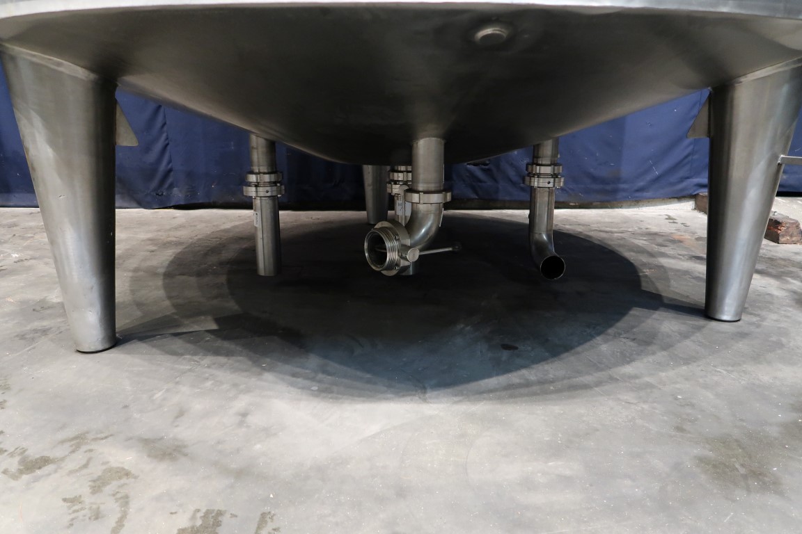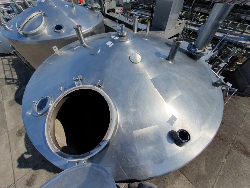 Vertical insulated cip tank. Previously used for lye. Nominal volume: 10.000 liter. Multiple connections in top and bottom. 2x Manual buttefly valves on outlet. With sample valve. 1 x Sight glass in top. 1 x E&H electronic pressure sensor/transmitter. 1 CIP spray bowl. Manhole in top, round Ø 47 cm. 3 Adjustable feet with with extension legs. Inside dimensions of tank: Ø 230 cm and cilindrical height 230 cm. interior needs cleaning. Total dimensions: Ø ca. 240 cm x h. 370 cm (without extension legs).