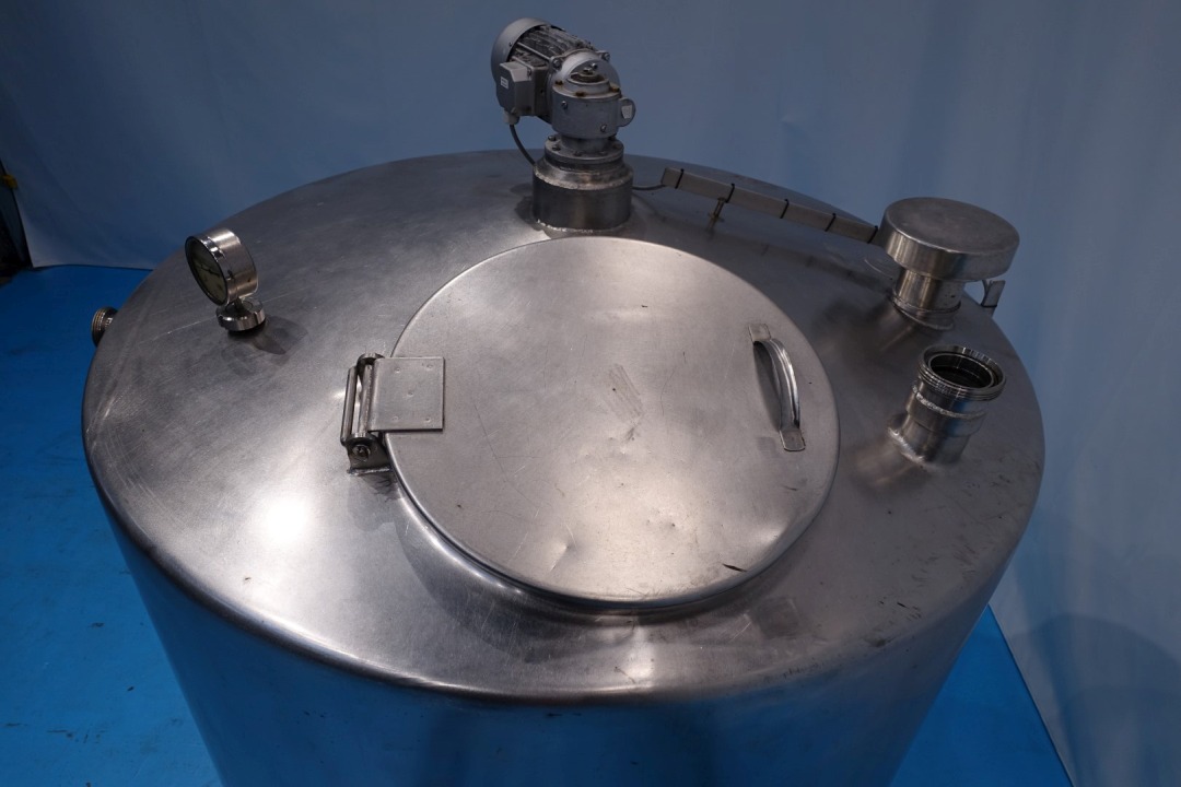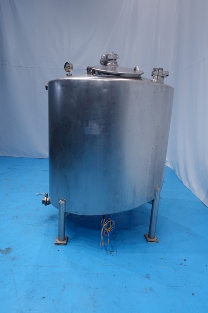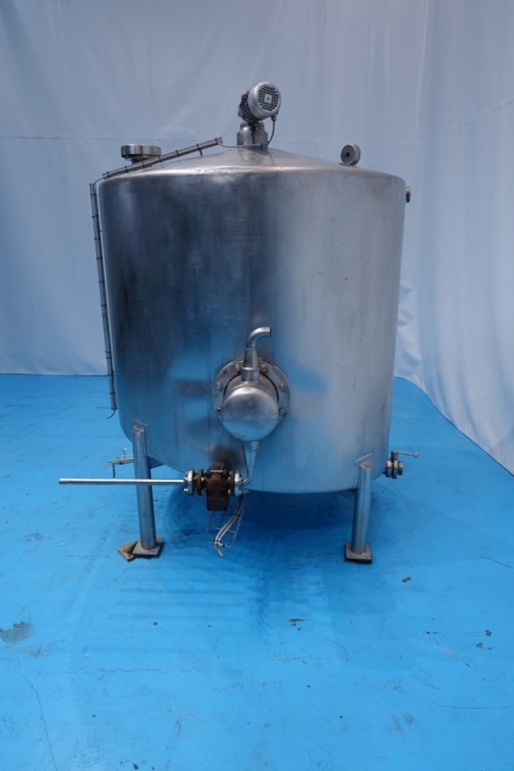 CIP tank with agitator and spiral tube heater inside the tank. Blade agitator - engine: 0,37 kW - 1,2 A - 1.370 rpm - 50 Hz. Spiral tube heater: 86 pipes - inner pipe Ø 10 mm - tube Ø 260 mm - tube length 98 cm. Manhole Ø 50 cm. Tank dimensions inside: Ø 1,45 meter - cylindrical height: 1,20 meter. Connections 1 x 2,5 " Din - 1 x DN80 Din - 1 x 2,5" SMS. Total dimensions: 180x165x230 (lxwxh) cm - weight: 291 kg.