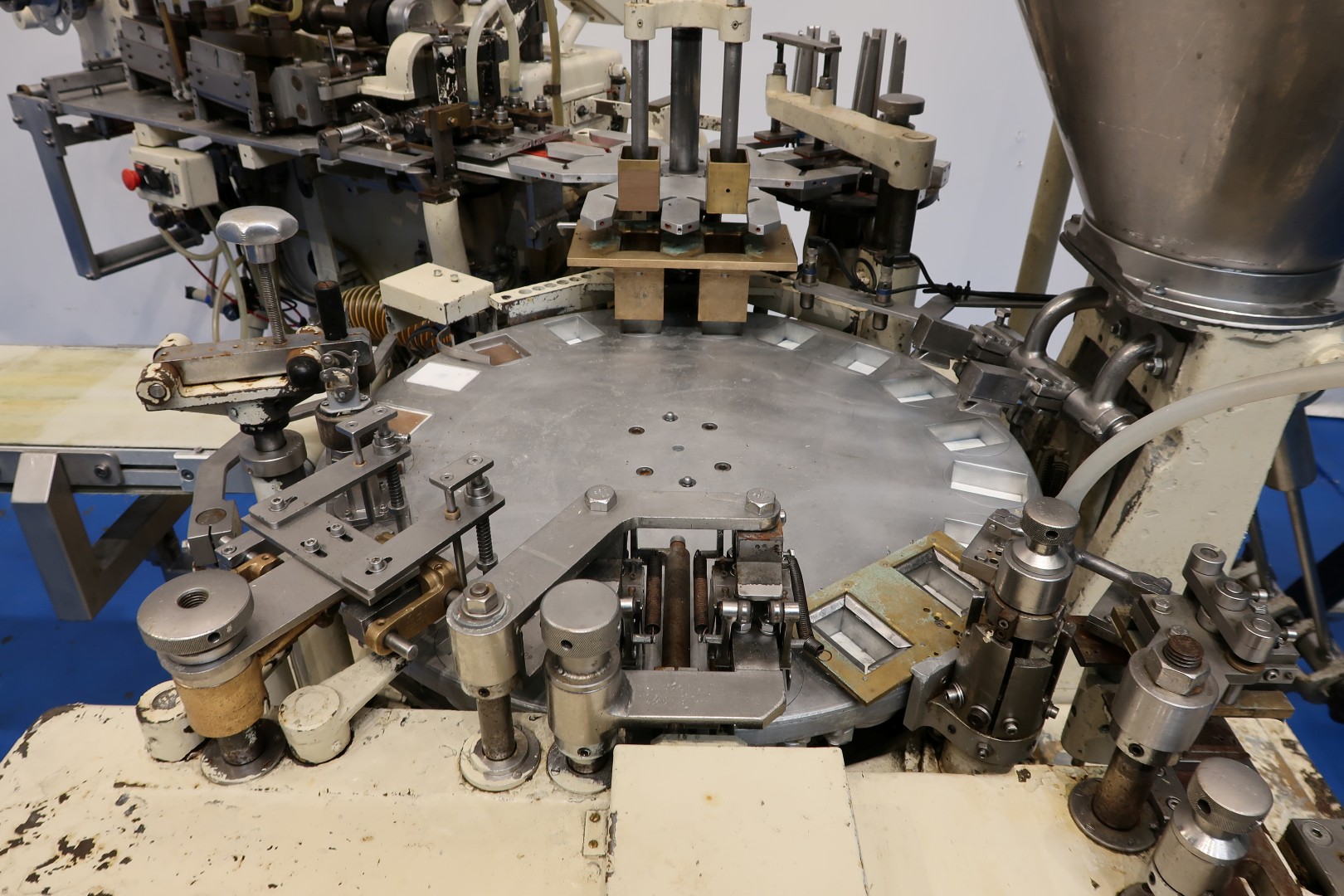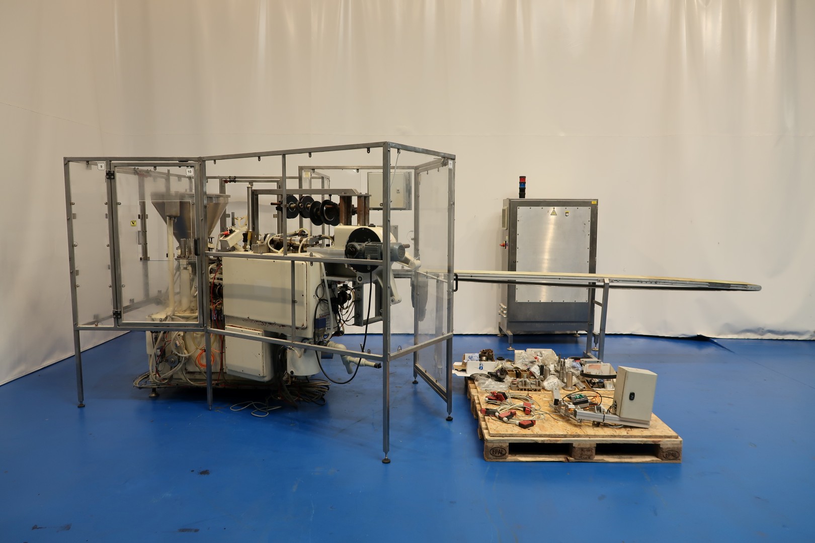 Automatic filling and wrapping machine for rectangular portions of processed cheese. Double head piston doser with product hopper with scraper agitator and cover. Format rectangular portions: 71x52x15 (lxwxh) mm, 50 gram. With easy opening system by a single strip red cord onto each portion. Product: processed cheese/ cream cheese, semi liquid, hotfill. Working principle: Bottom foil infeed from reell dispending preformed etiket/lable with cold glue on the foil, , foil cut and formed,filling, top foil from roll, folding, sealing. The machine had a Major rebuild in 2005, Including controls, PLC Siemens Simatic S7. Polycarbonate safety protections with door sensors. Conveyor belt length 440 cm, width 26 cm. Inculding lot spare parts.excluding vacuumpump. Documentation: parts list available. Total dimensions: 600x310x195 (lxwxh) cm - weight: 2.780 kg's.