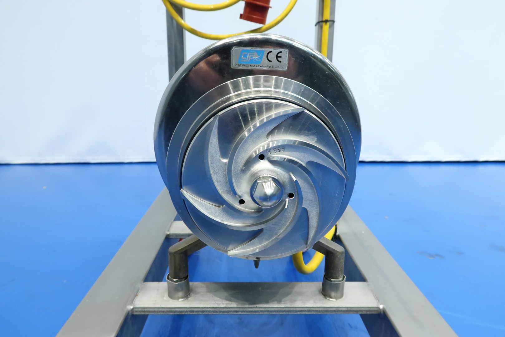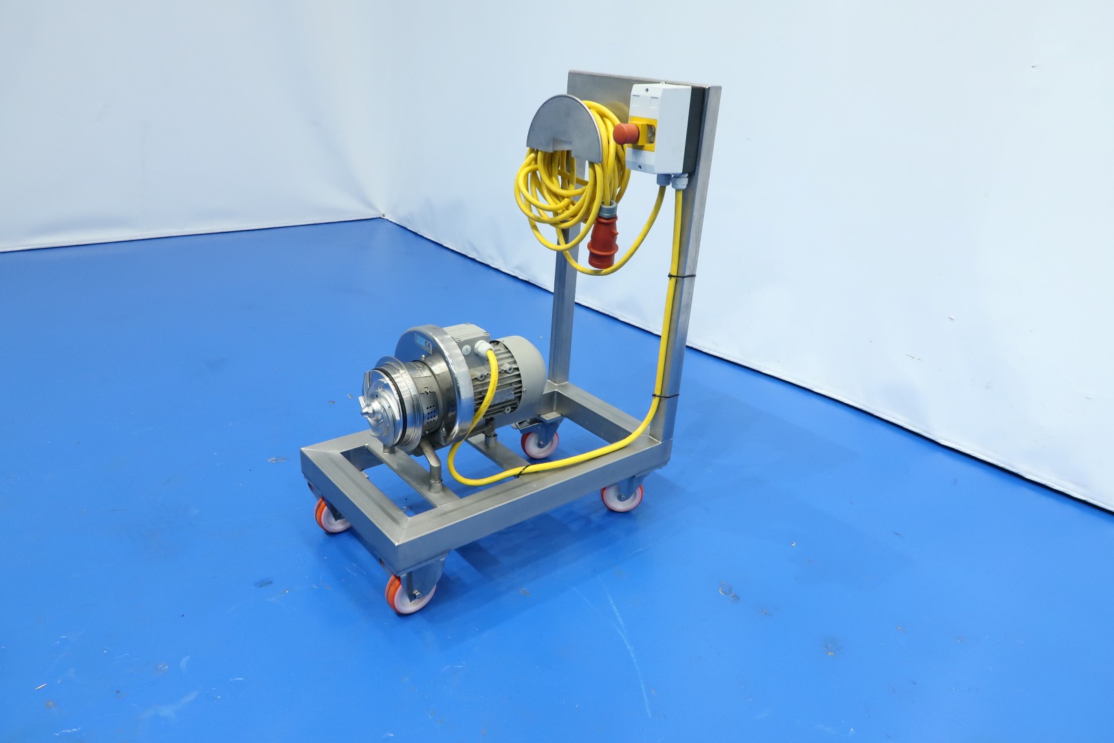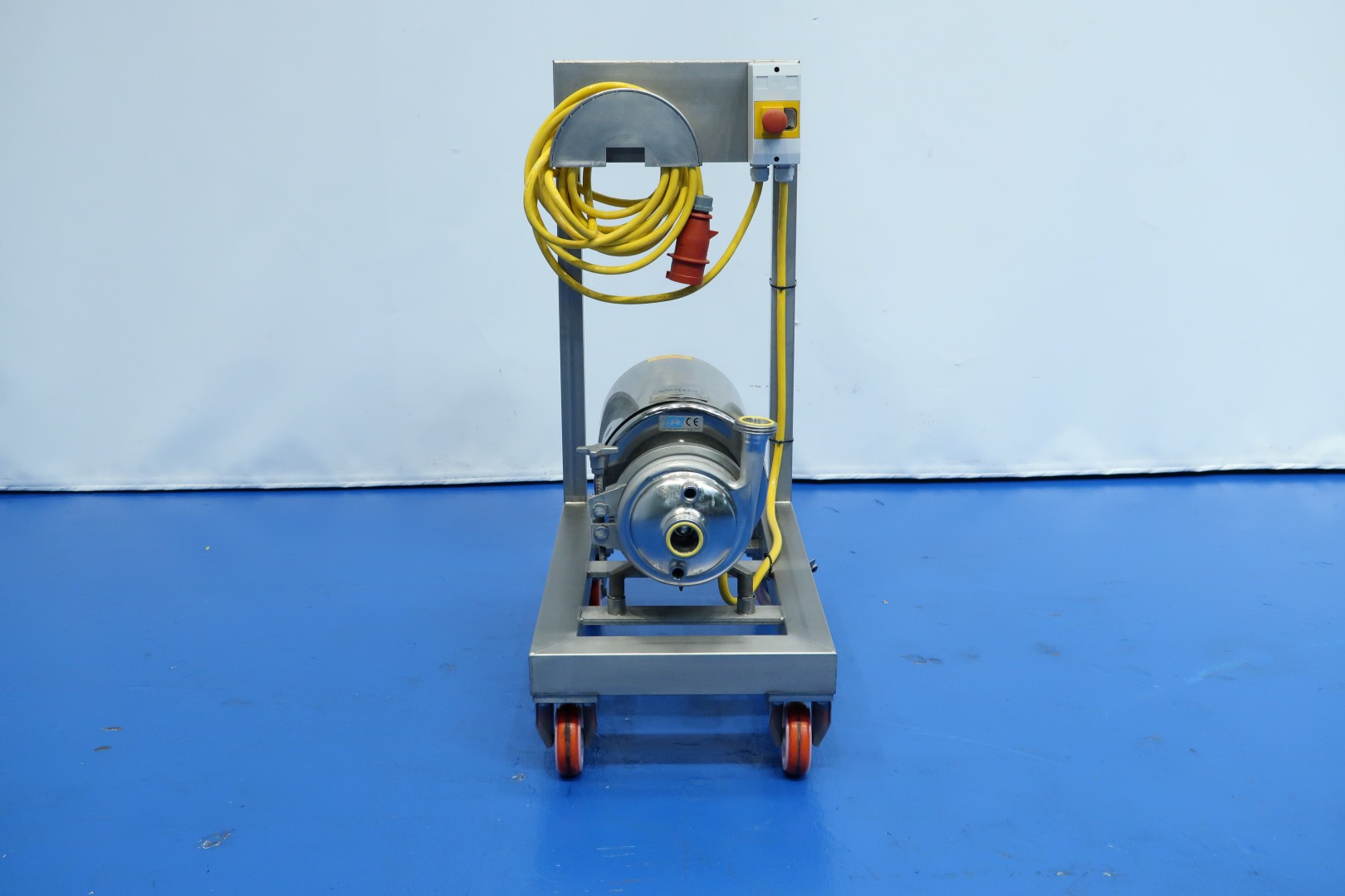 Sanitary centrifugal pump on mobile SS frame with on/of switch. Motor: 1,3 kW - 2,4 A - 2.845 rpm - 50 Hz. Impellor diameter: 145 mm. Pressure: approx 2 bar. Double jacketed head for heating on the head. Connections: (in) 2" SMS / (out) 2" SMS. Total dimensions: 70x40x95 (lxwxh) cm - weight: 47 kg.