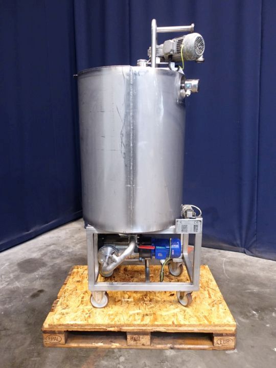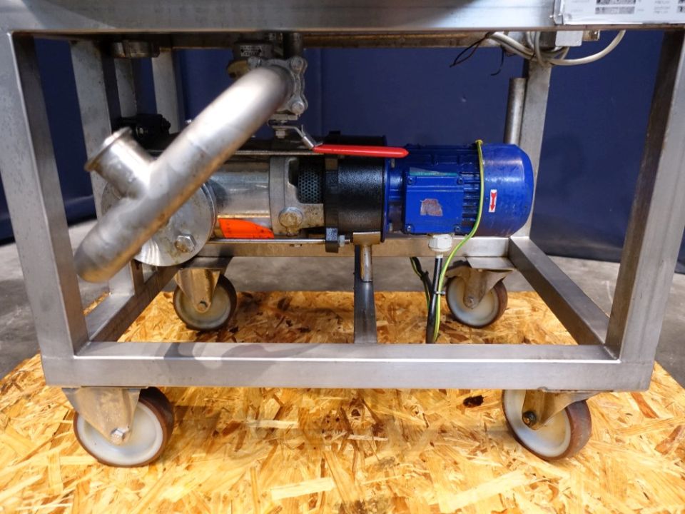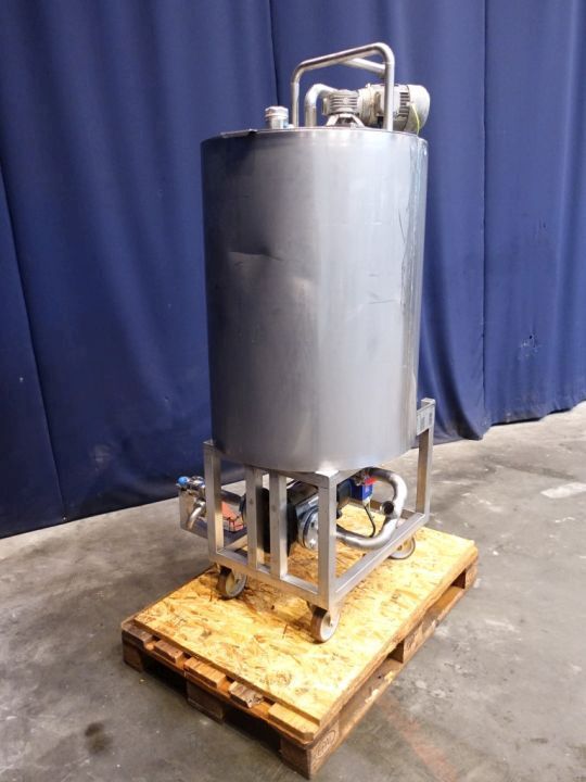 Mix tank mobile. Propellor agitator. Motor: 0,37 kW - 2800 rpm - n2: 280 rpm. Lid. Spraybowls. Outfeed pump (KSB). Total dimensions: 90 x 90 x 180 cm.